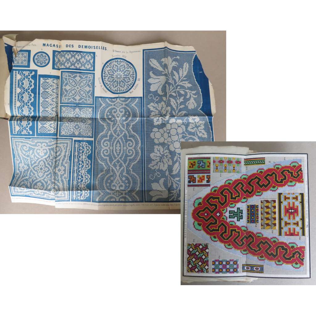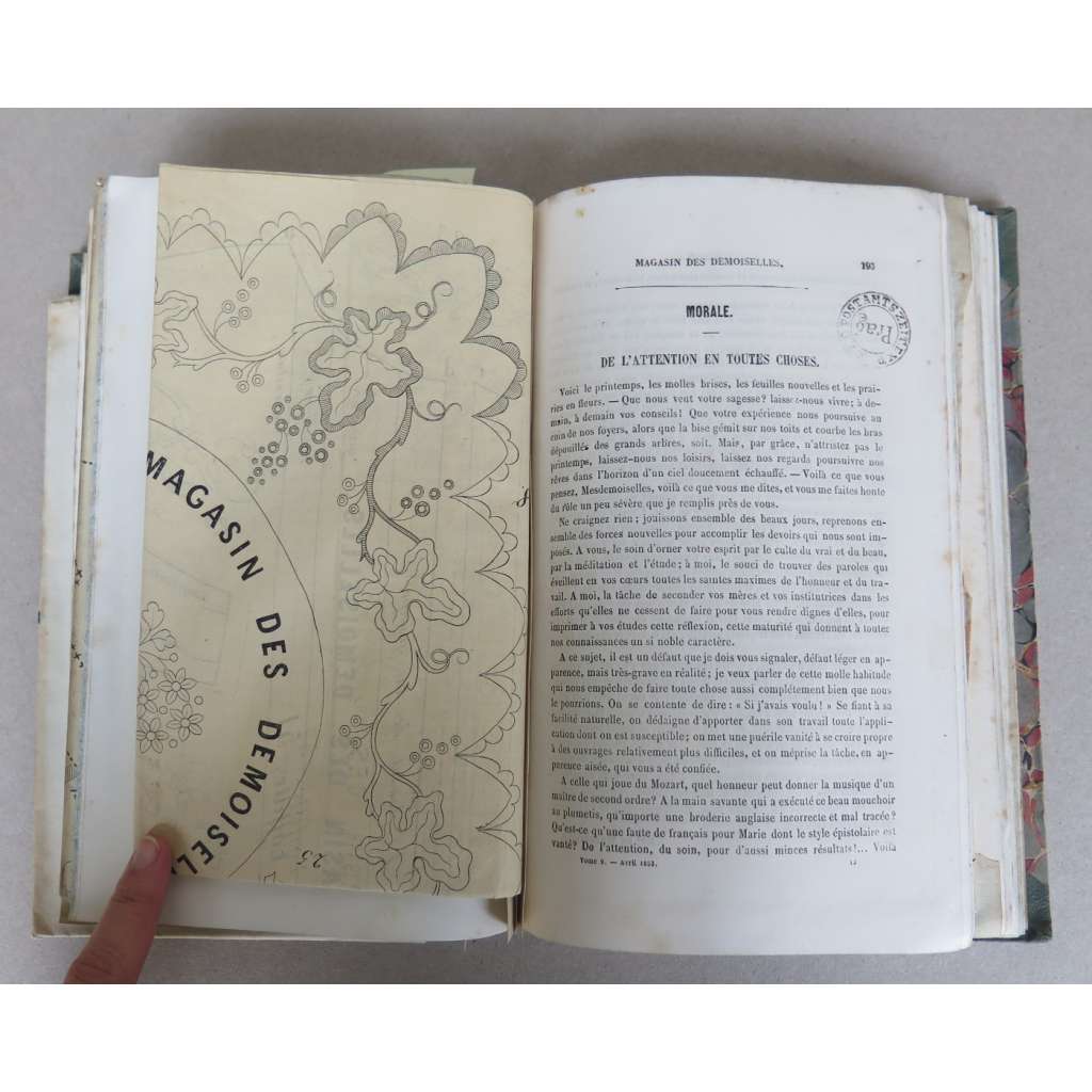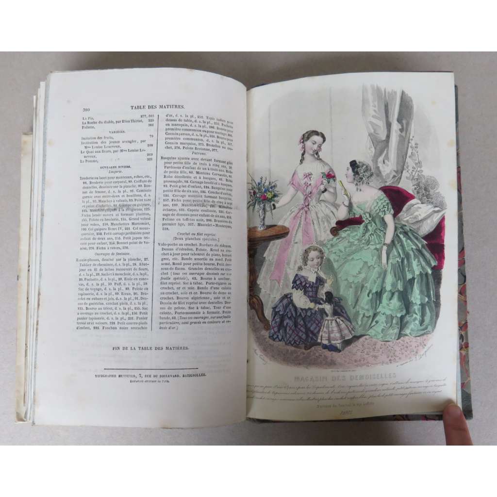 Vydání: Paris: Administration et redaction du Magasin des Demoiselles 1852-1853, poloplátěná dobová vazba se zdobenými deskami a zlaceným titulem na hřbetu, strany 1-128 a 161-380 s 10 kolorovanými rytinami s módou, 2 tabule (žánrové, ilustrace k textu), 1 barevný vzor na vyšívání, 1 skládaný modro-bílý vzor k háčkování a 11 skládaných tabulí se vzory, 4° (17 x 26 cm)