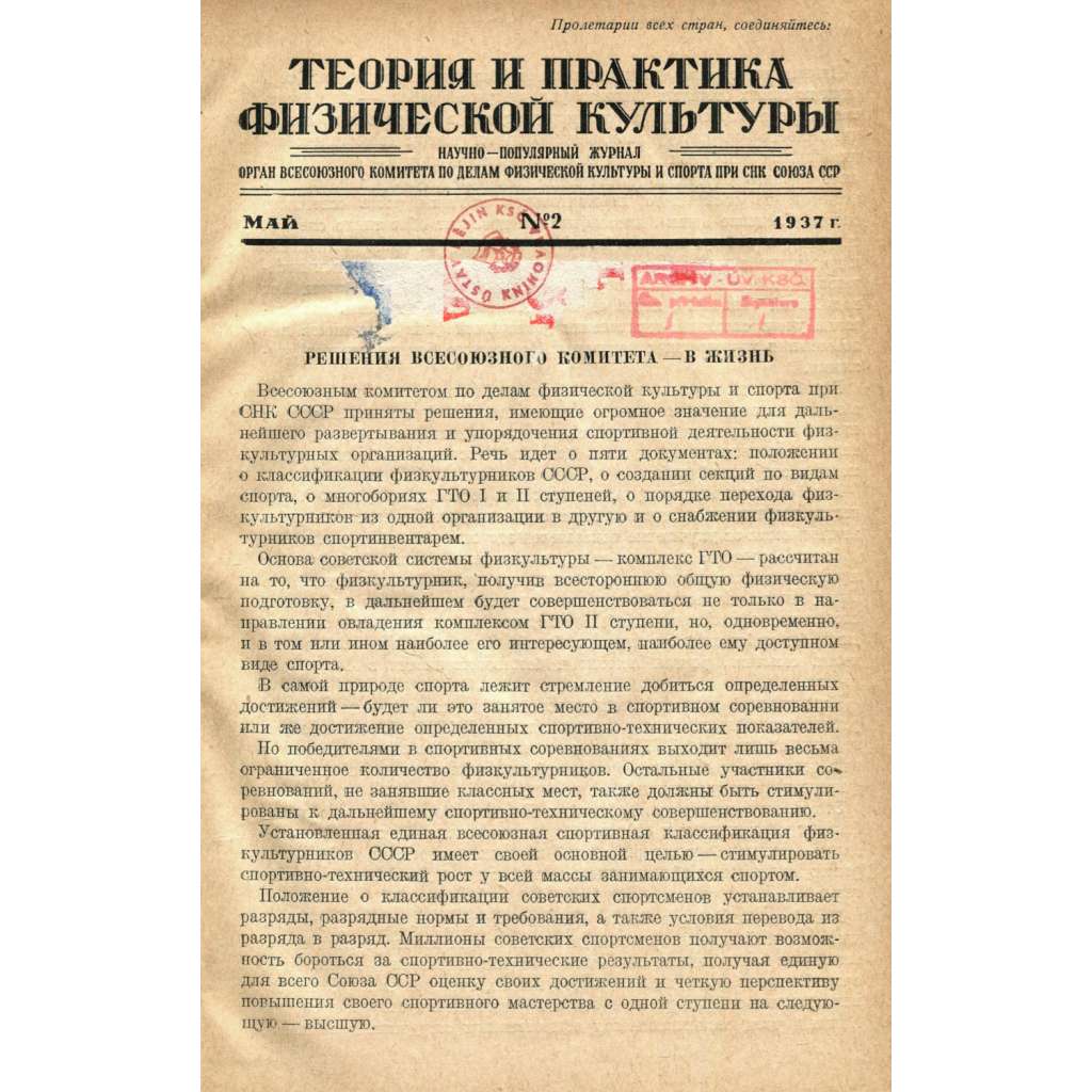 Šest čísel sovětského odborného časopisu zaměřeného na vrcholový sport a tělesnou výchovu; svazek obsahuje čísla 2 (únor), 4 (duben), 8–11 (srpen–listopad) z roku 1938. Časopis vycházel jako měsíčník. Ilustrováno.