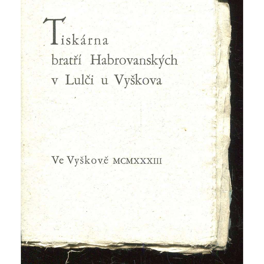 Tento spisek doprovázený 3 ilustracemi, věnují účastníklm IX. bibliofilského večera dne 4. listopadu 1933 knihtiskárna Fr. Obziny a Alois Báňa ve Vyškově