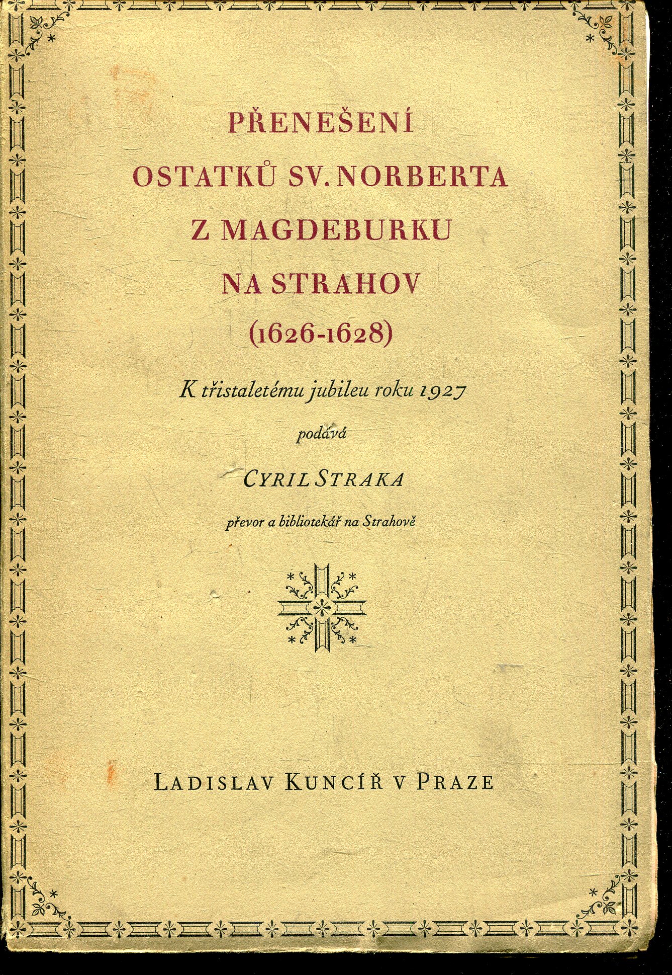 Dobrý stav; na zadní desce je nalepen štítek, na předsádkách je signatura a několik razítek, další razítka či signatury na původní obálce a několika stranách, na vnitřním okraji listů jsou drobné perf
