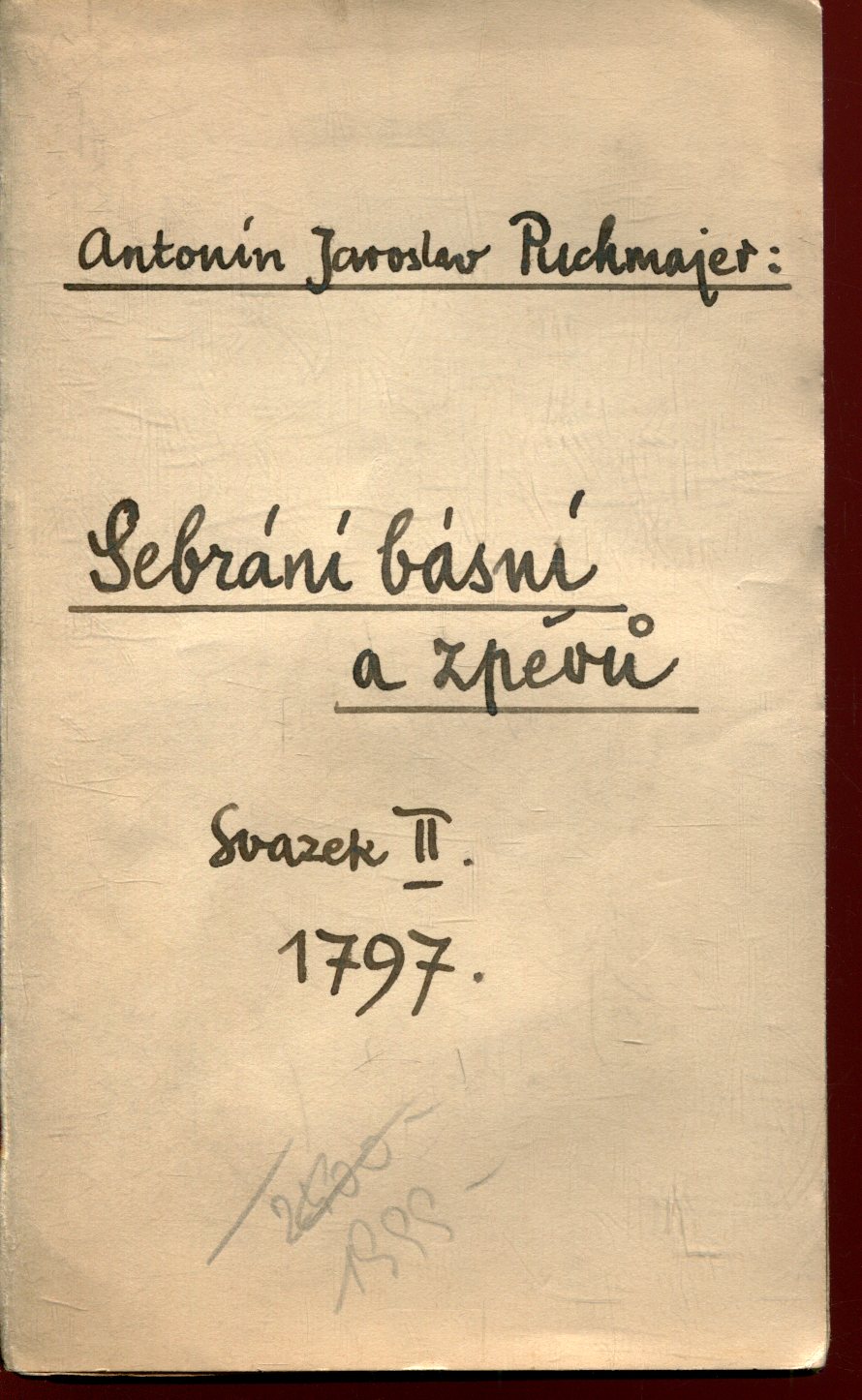 Stav dobrý, desky a hřbet jsou lehce odřené a mírně ušpiněné. Vyřezaný knihovní exemplář, místy jsou hnědé skvrnky od stáří