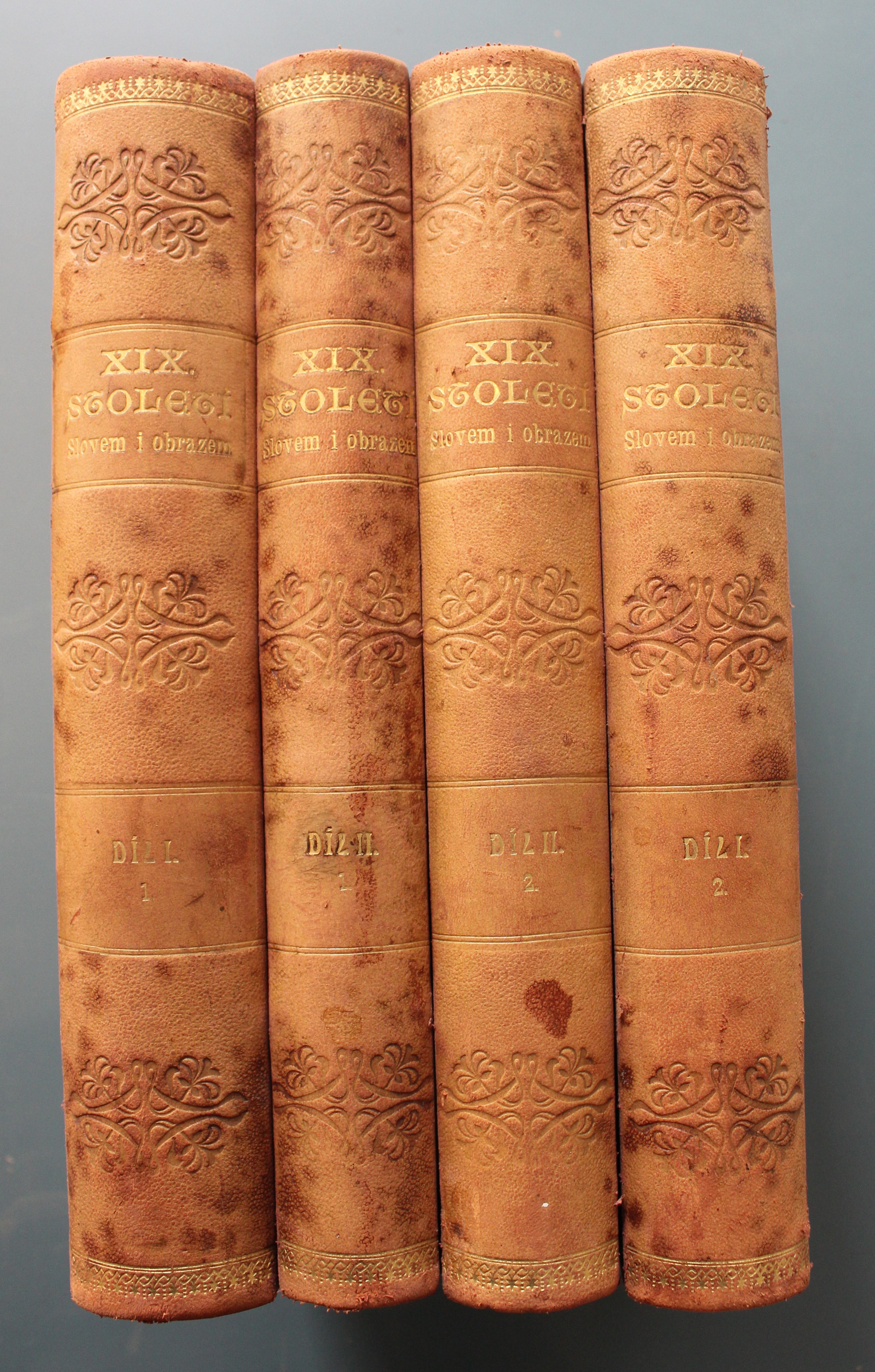 zevně odřená, poněkud otlučené hrany, zbytky štítku se signaturou na hřbetu, patitul a titul se skvrnami, vazba na začátku prasklá, několik stran s nepatrnými hnědými skvrnami, celkově velmi dobrý st