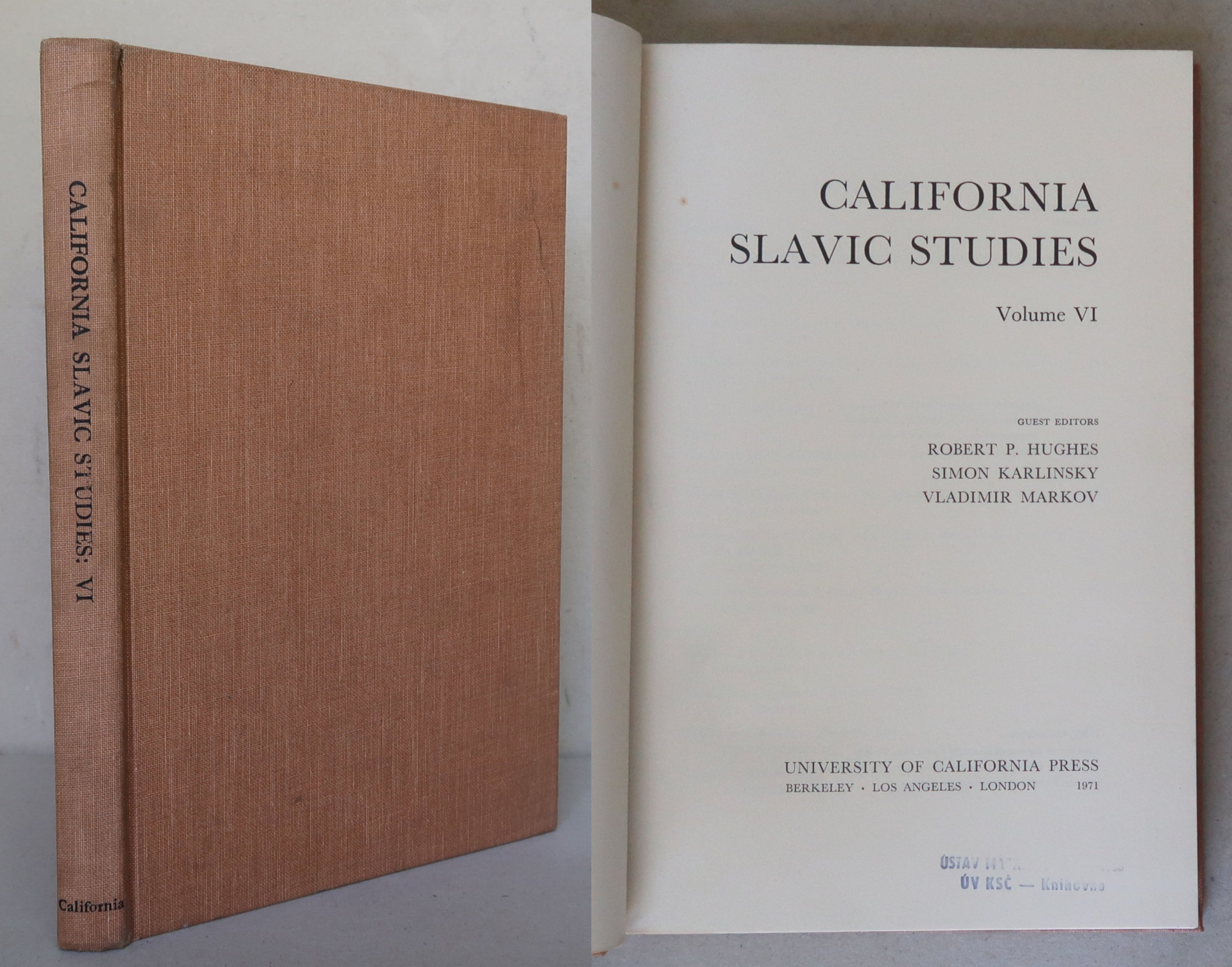 Velmi dobrý stav. Desky jsou lehce odřené. Na přídeští, na předsádce a na některých stranách jsou razítka z knihovny.