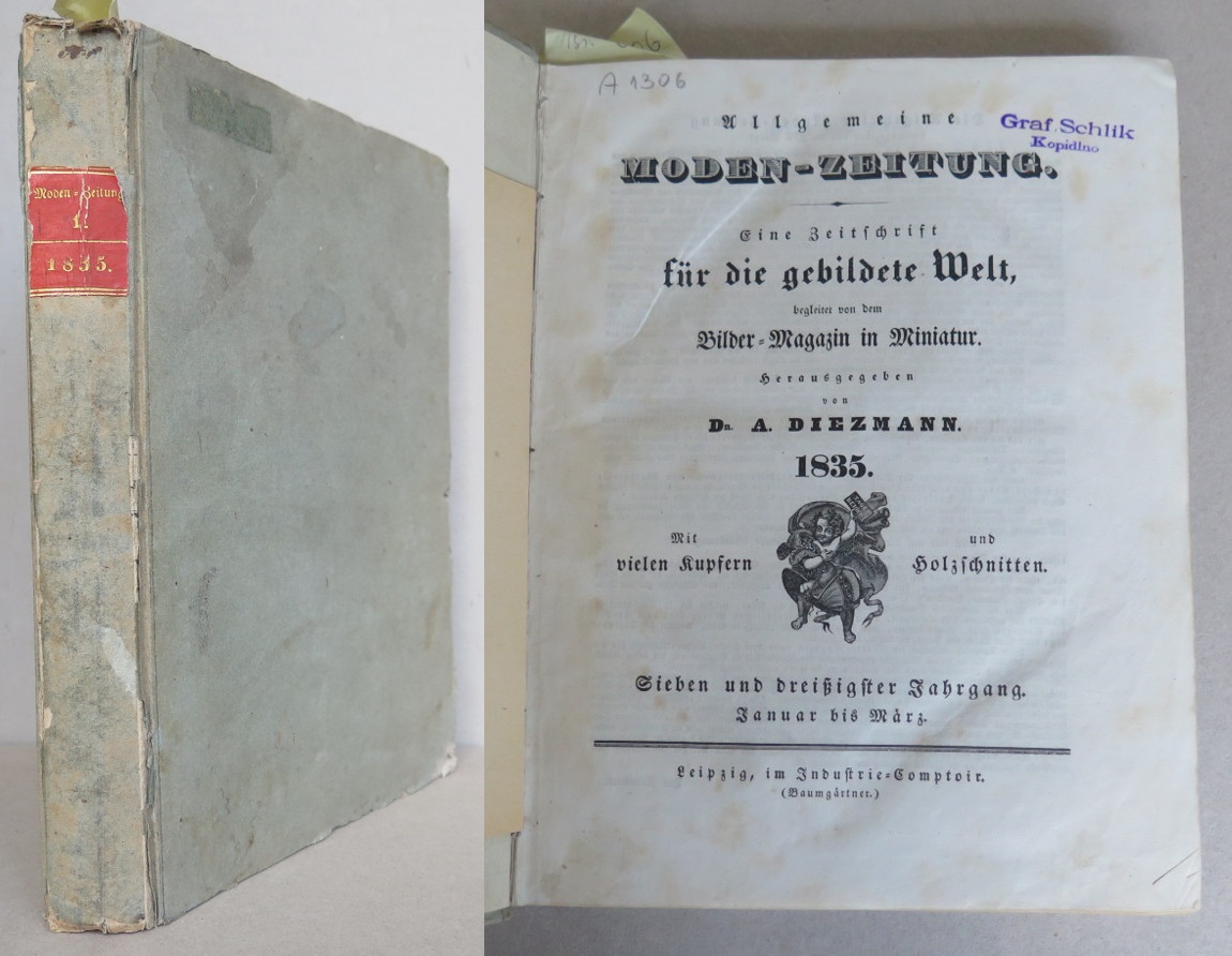 okraje desek odřené, některé stránky poněkud zahnědlé, obsahuje ilustrace s módou, z "Allgemeinen Muster-Zeitung" z 1. 1. 1857, chybí ilusrace k č. 20 a 24 (6. ročník) a k č . 5 (7. ročník),