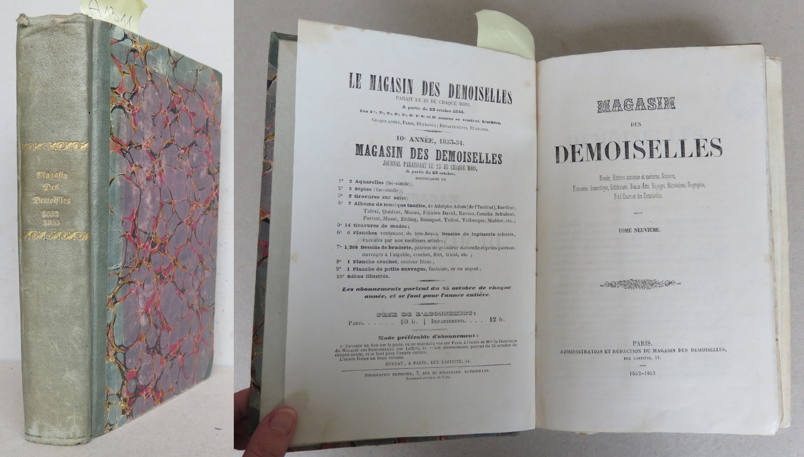 Paris: au bureau de journal 1847, dobová celoplátěná vazba se zlaceným štítkem na hřbetu, 384 stran s ilustracemi v textu, 4 kolorované mědiryty s módou, 12 skládaných vzorů, 6 nekolorovaných tabulí,