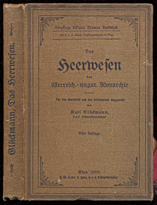 Wien: Verlag von L. W. Seidel & Sohn, k. u. k. Hofbuchhändler 1909, celoplátěná vazba s černou ražbou na přední desce a hřbetu, IV+380 stran, skládaná mapa "Landwehrterritorial- und Landwehr-