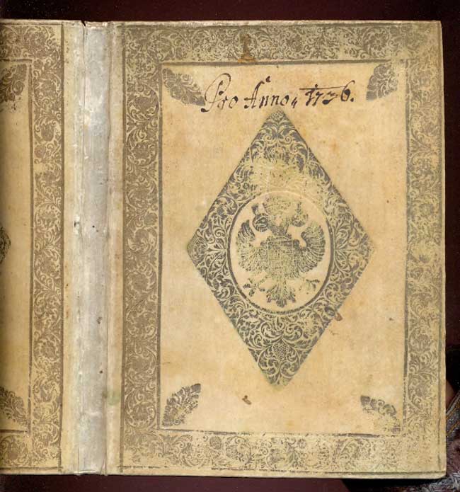 Prag: in der königl. Hoff-Typographia 1736, pův. pergamenová vazba se zlacením a slepotiskem, [2]+LXXX+[4] stran s dřevořezy, jedním mědirytem a skládanou tabulkou, 8° (15,5 x 21 cm)