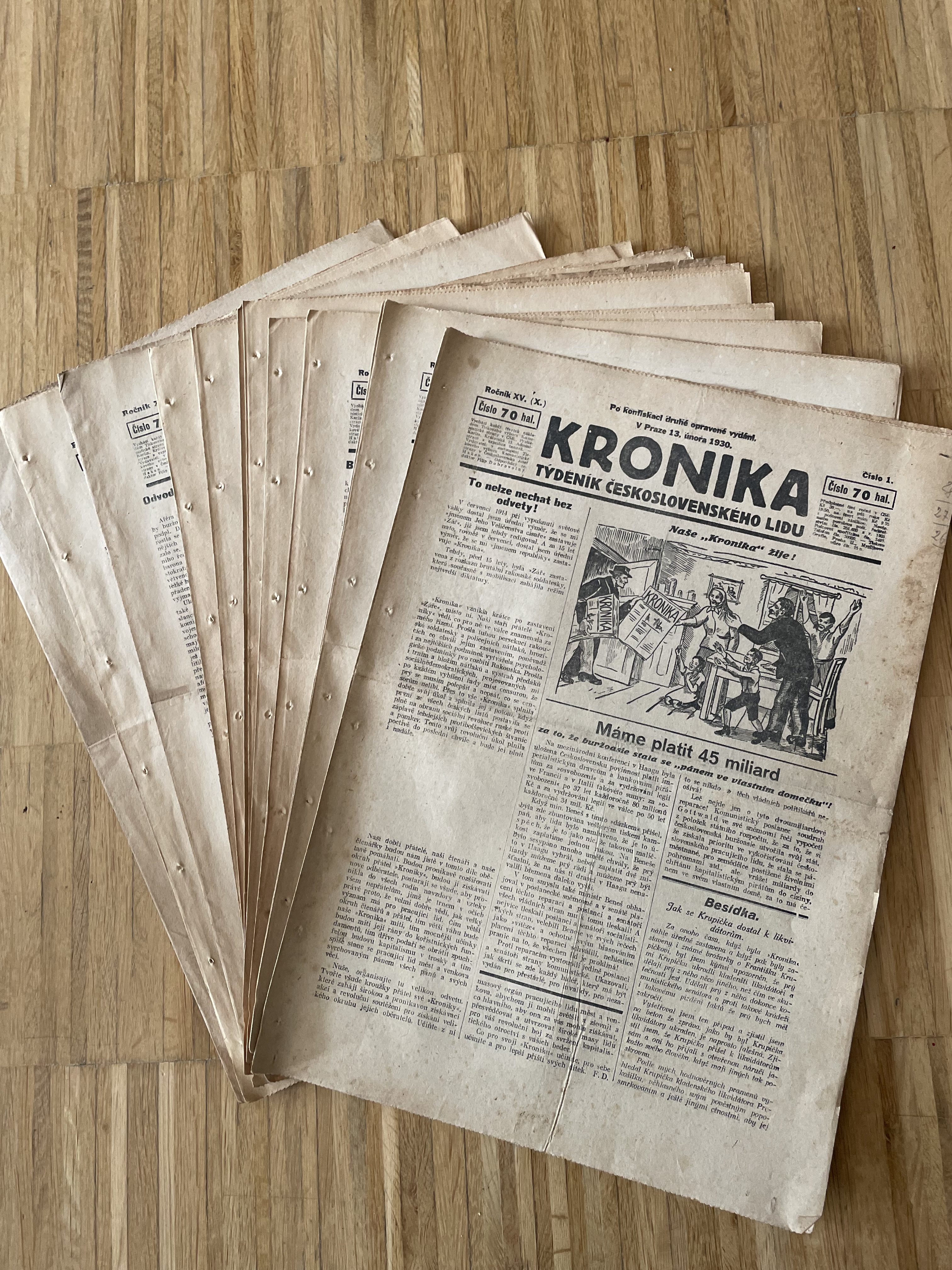 Stav velmi dobrý. Noviny jsou lehce zažloutlé, u hřbetu s dírkami, na prvním čísle je u hřbetu skvrnka a ve střední části je červená šmouha