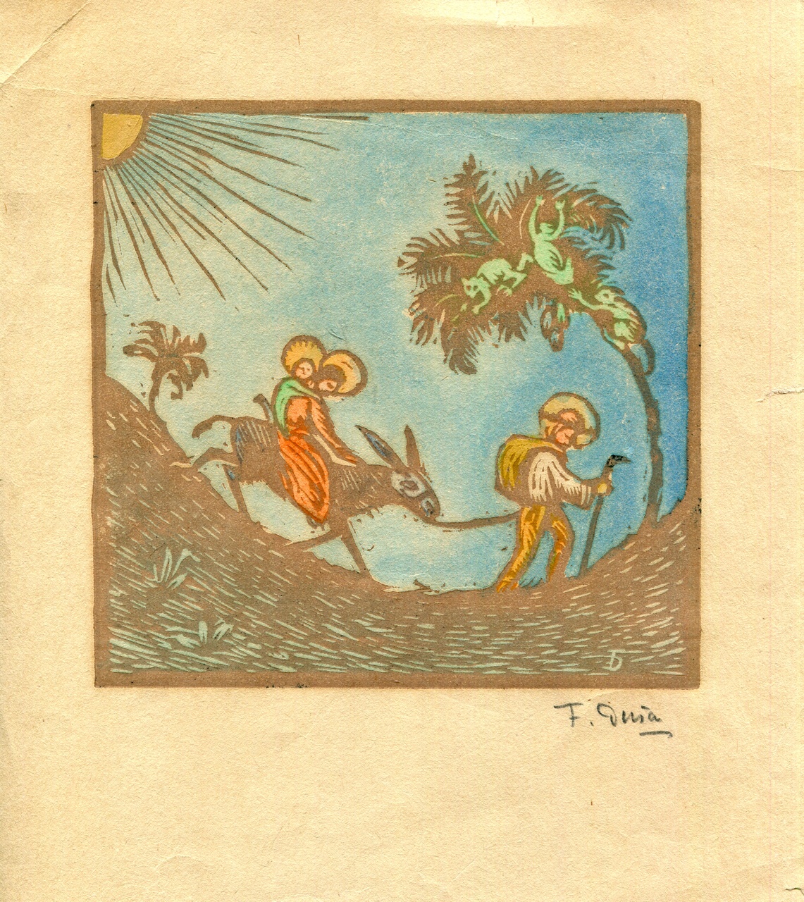 Dřevoryt, kolorovaný, podepsaný, 15 x 15 cm.