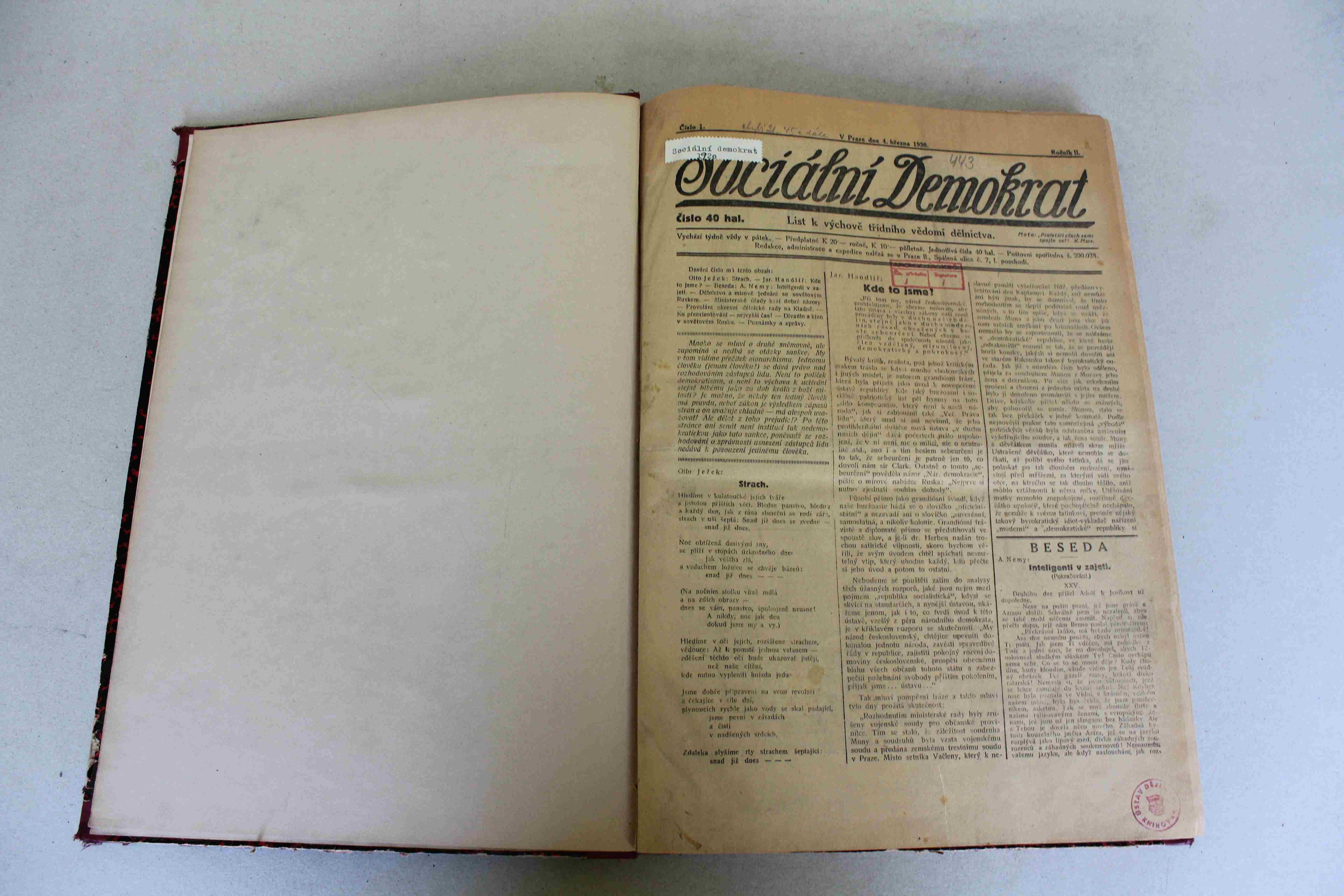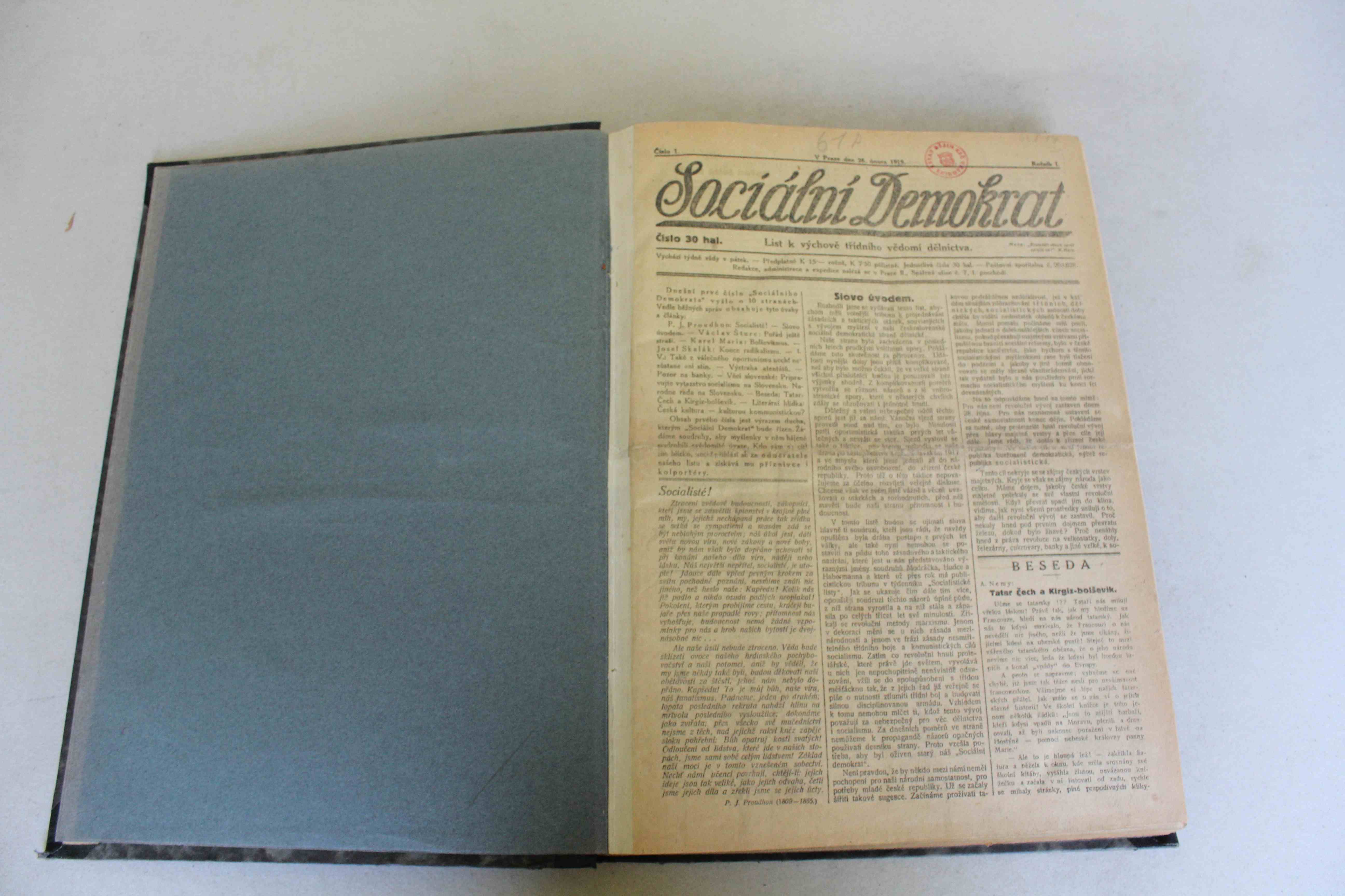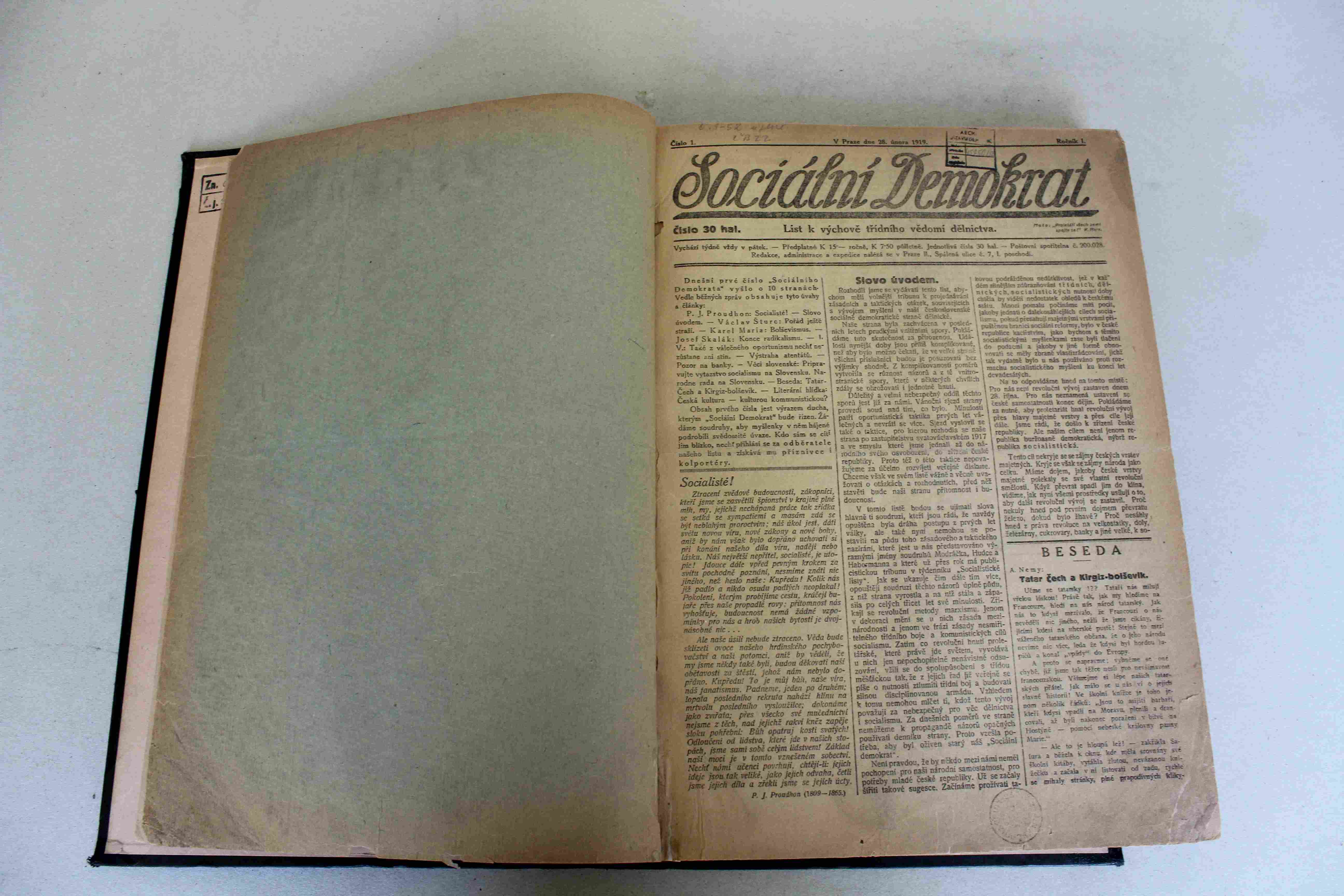 Stav horší, noviny jsou zažloutlé, ve hřbetu po celé délce roztržené.