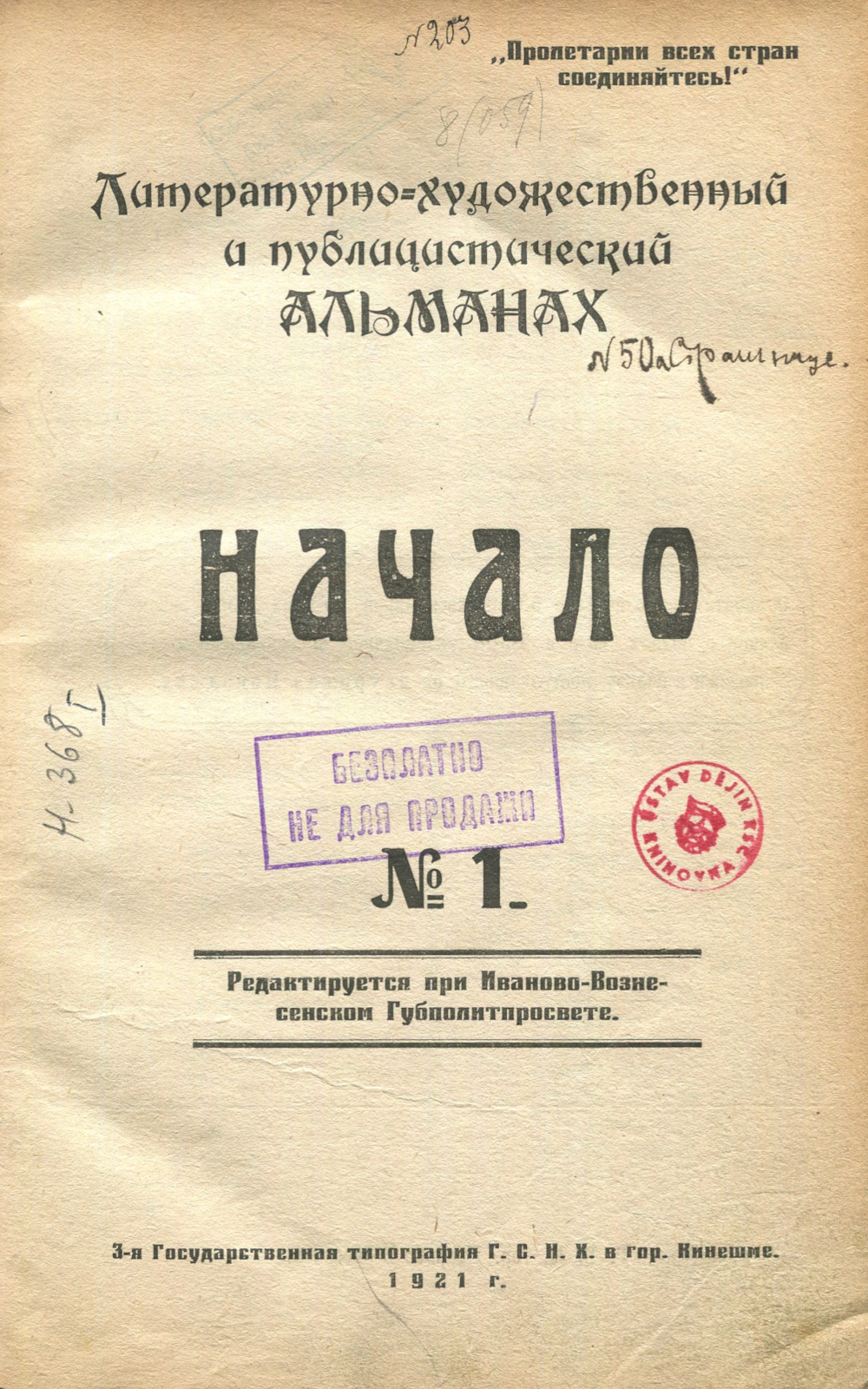 Ivano-Vozněsensk [Ivanovo]: Ivano-Vozněsenski Gubpolitprosvet - Ivano-Vozněsenskoje otdělenie Gosudarstvennogo izdatělstva 1921, váz., 87 s., 8° (17 x 25,5 cm)