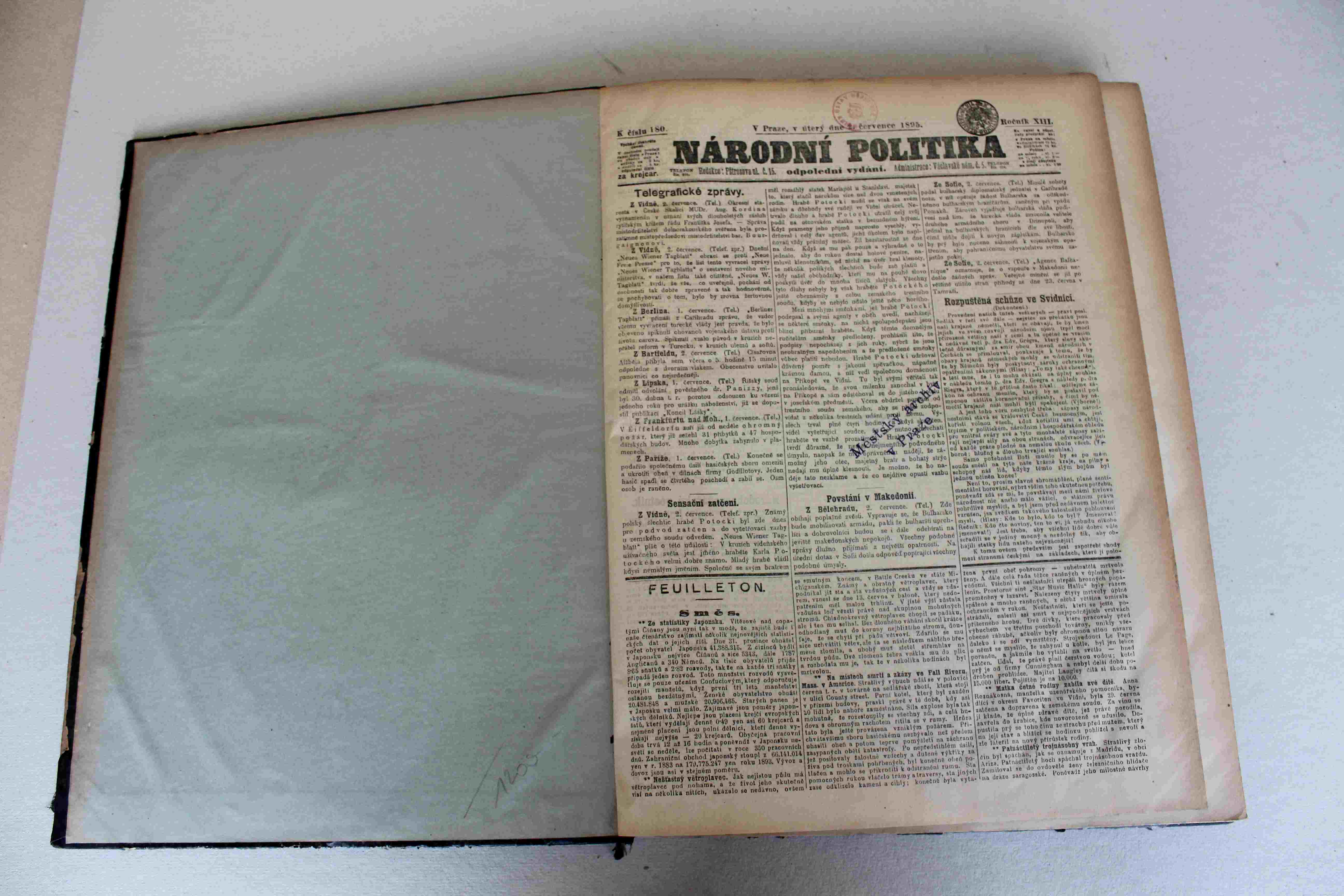 Dobrý stav; desky prvních dvou svazků jen mírně opotřebované, desky modrého svazku opotřebované a místy mírně naražené, na všech zadních deskách je nalepen štítek, předsádky s razítky a signaturou, na