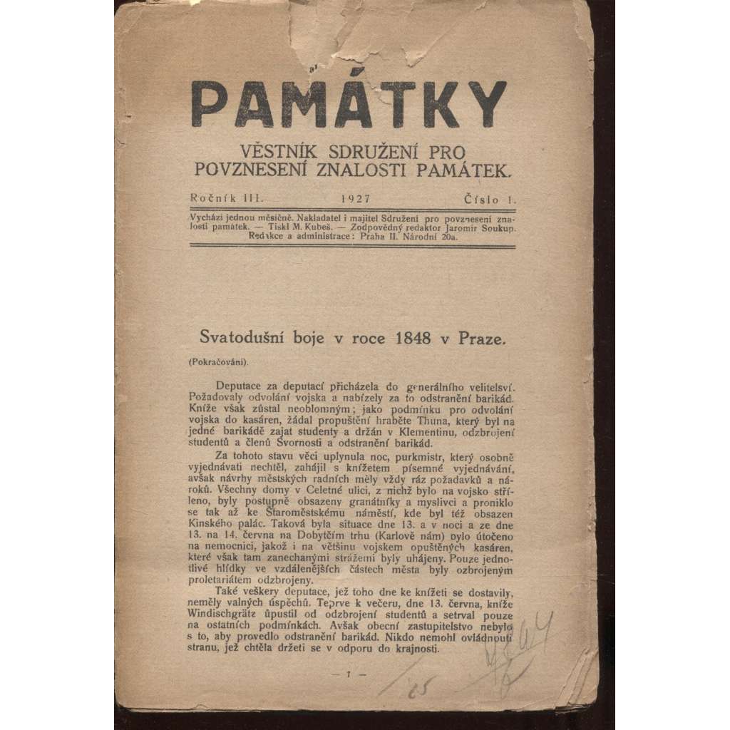 Desky zašpiněné a potrhané, rohy desek ohnuté, nerozřezané listy, listy zahnědlé, jinak v uspokojivém stavu