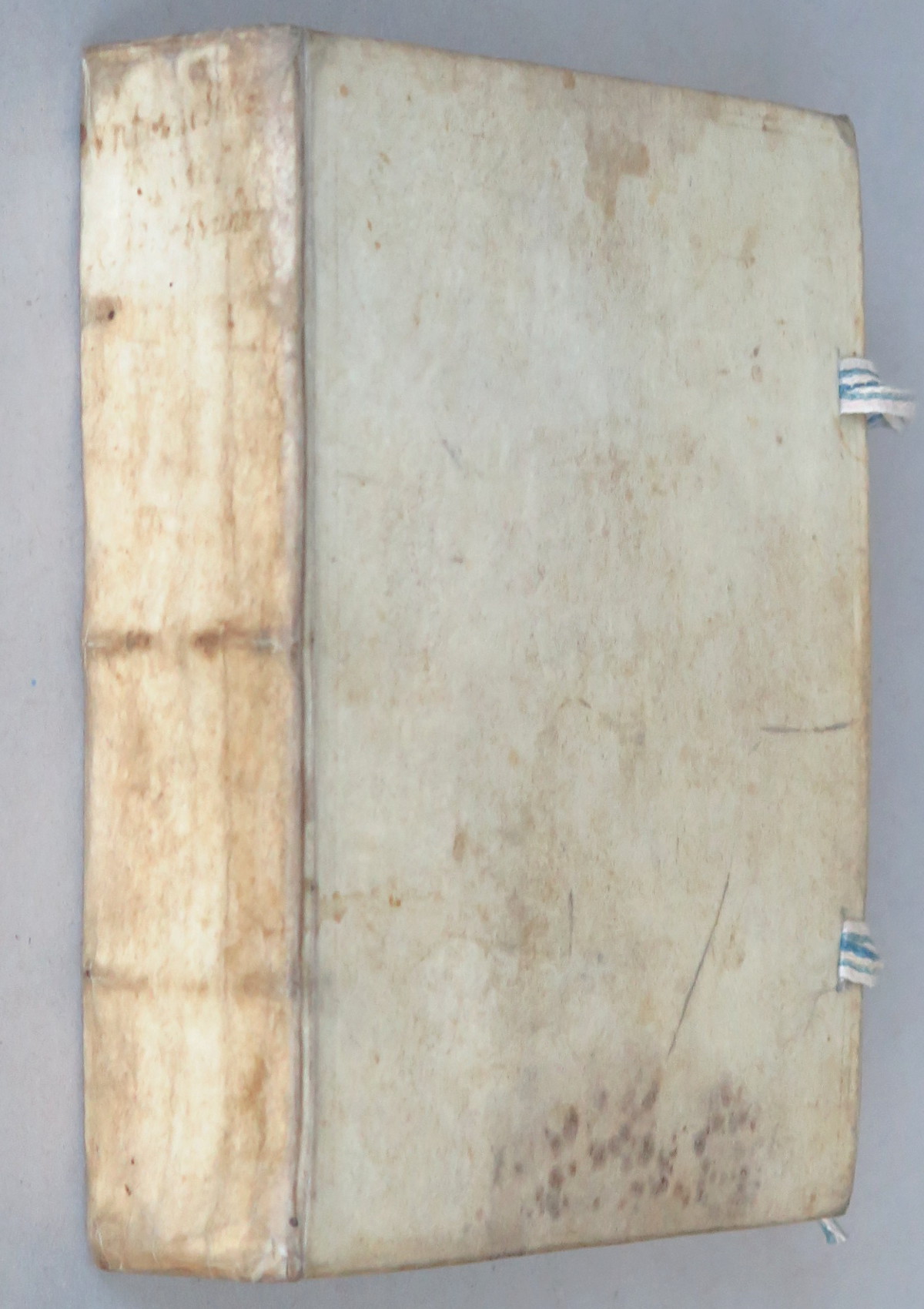 Dobrý stav; desky opotřebované, se starými signaturami, kůže trochu odřená, horní ořízka ztmavlá, stránky zažloutlé či se žlutými skvrnkami od stáří, první titulní list se ztrátou, perforací a starými