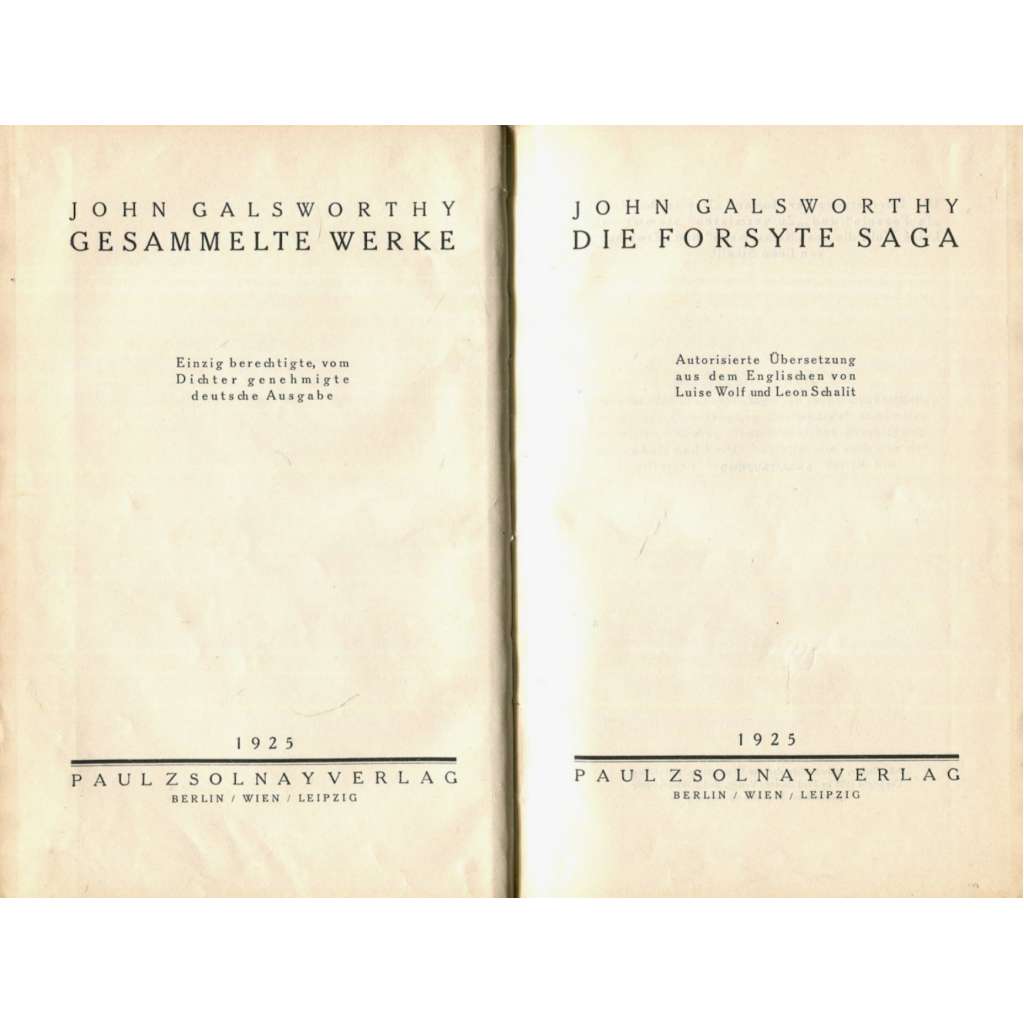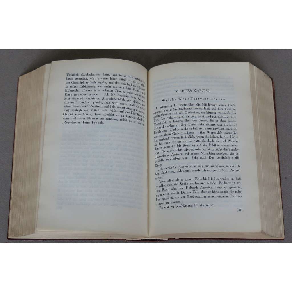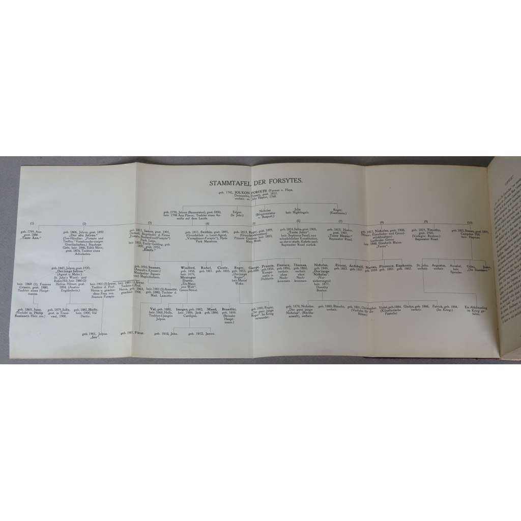 První německé vydání Galsworthyho "Ságy rodu Forsytů"; přeloženo v úplnosti. První dotisk ("6.-10. Tausend"); zřídkavá verze v celokožené nakladatelské vazbě. Kniha obsahuje rozkládací tabuli s rozrodem Forsytů (s. IX-X).