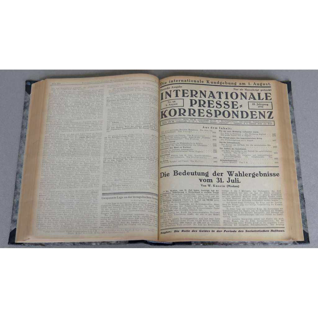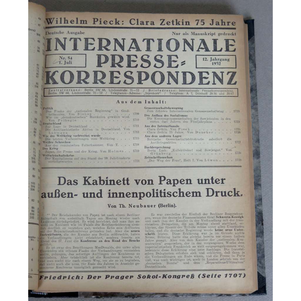Druhá polovina (Halbjahr) dvanáctého ročníku mezinárodní tiskové služby Komunistické internacionály. Zahrnuje čísla od 1. 7. (č. 54) do 29. 12. 1932 (č. 108); doplněno rejstříky pro tuto druhou polovinu ročníku; chybí č. 73 a 107. Svázáno do dvou fyzických svazků.