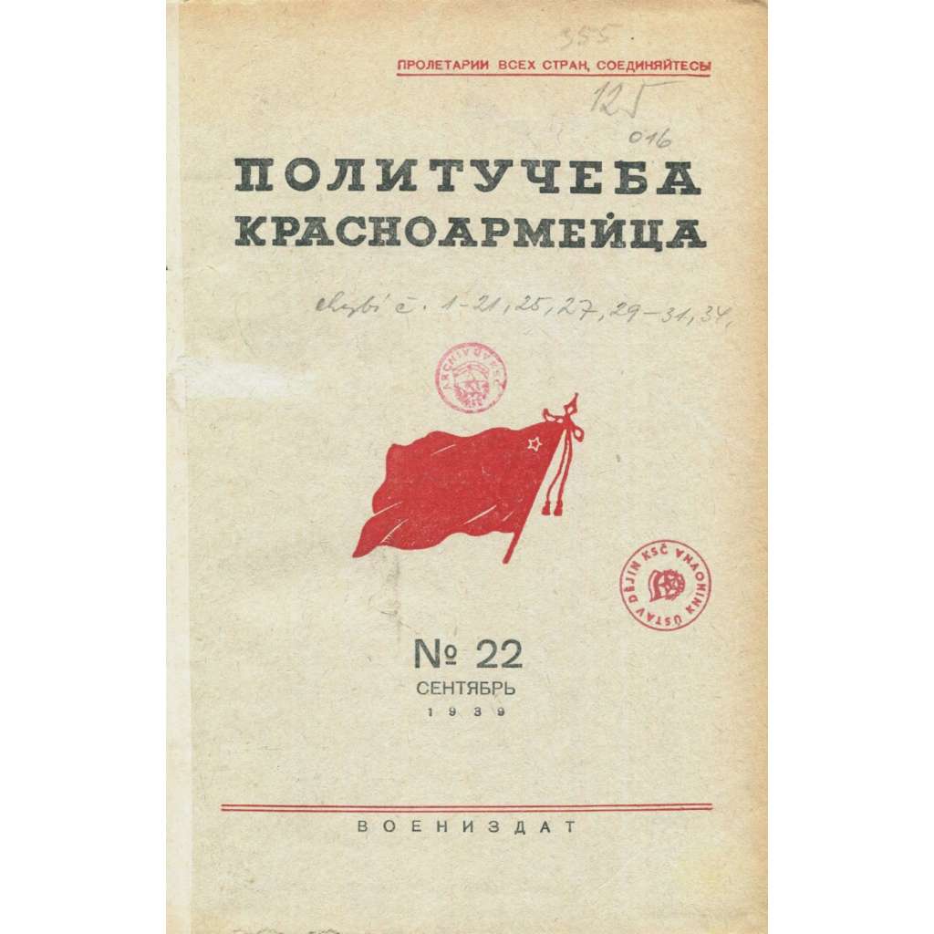 Některá čísla sovětského časopisu pro důstojníky a politruky Rudé armády zodpovědné za ideologické školení; viz naskenovaný obsah čísla 22. Svazek obsahuje různá čísla od září do prosince 1939; časopis vycházel 3krát měsíčně.