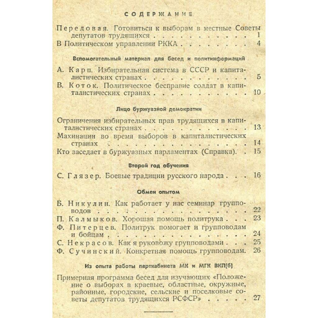 Titul a podtitul: "Политучеба красноармейца (В помощь групповоду политзанятий). Журнал Политического управления РККА" [Politučeba krasnoarmejca (V pomošč gruppovodu politzanjatij). Žurnal Političeskogo upravlenija RKKA]