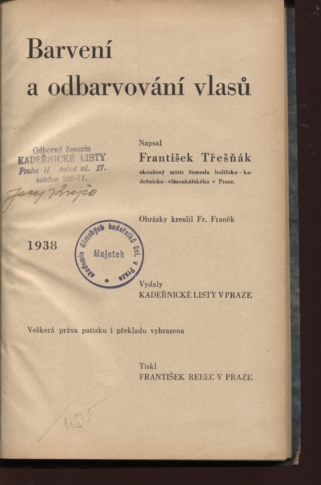 Kniha v dobové převazbě s vevázanou přední obálkou, formát 4°, 25 cm, 102 stran. Vyda..