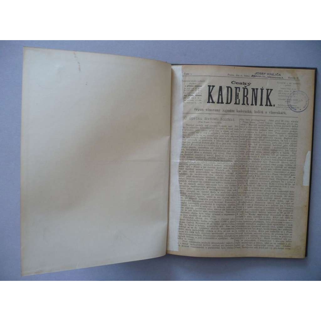 Velmi slušný stav, desky odřené a zašpiněné, hřbet poškozený - potrhaný a odřený. Stránky zažloutlé, vazba lehce uvolněná. Dvě stránky I.ročníku částečně chybí - viz obr.