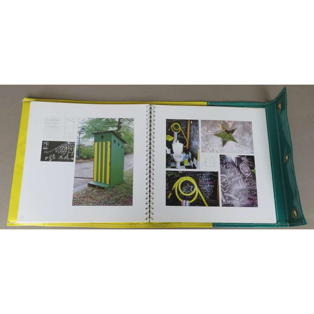 Kroužková vazba; přebal je vyroben z cirkusové plachty, tj. z plátna potaženého PVC; vybaveno kovovými očky a tkanicemi.