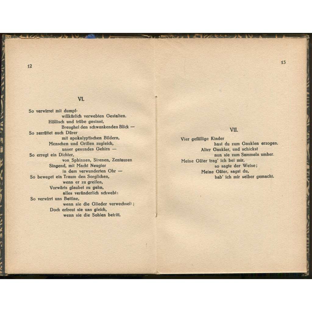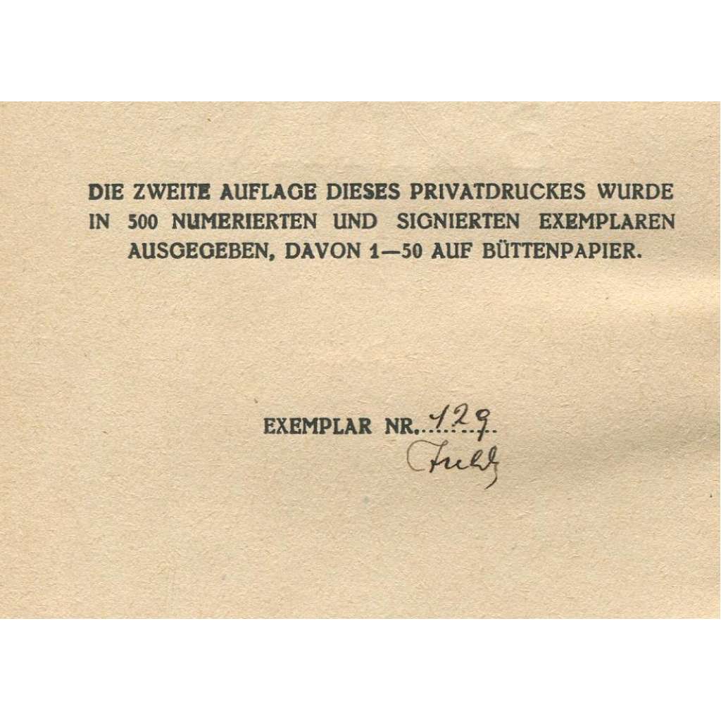 Vydání: Fiesole: Fred Robert von der Trelde [1923], druhé vydání, soukromý tisk, č. 129 z 500 číslovaných a vydavatelem podepsaných kusů, pův. kartonová vazba se zdobenými deskami a štítkem na přední desce, 23 stran, 8°
