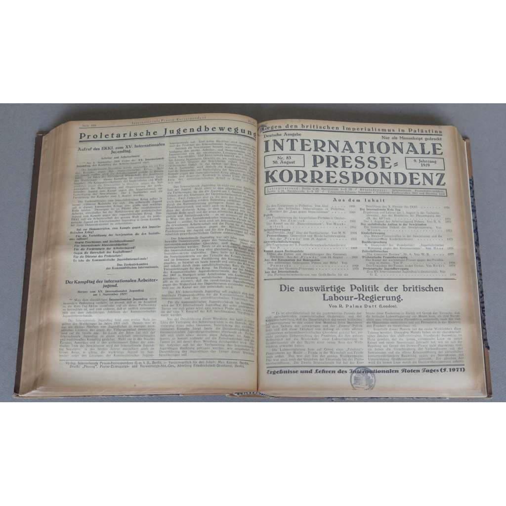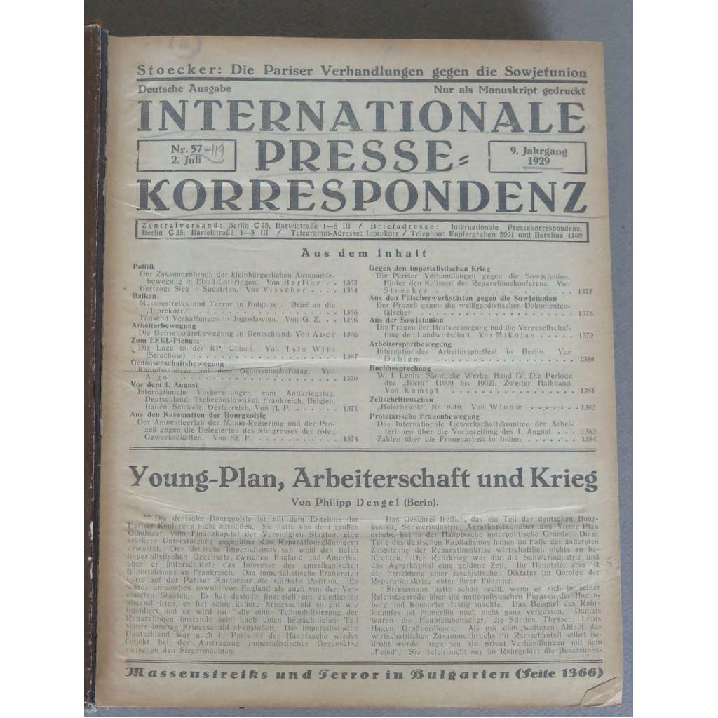 Druhá polovina (Halbjahr) devátého ročníku mezinárodní tiskové služby Komunistické internacionály. Zahrnuje čísla od 2. 7. (č. 57) do 31. 12. 1929 (č. 119); chybí rejstříky pro tuto druhou polovinu ročníku; žádné číslo nechybí.