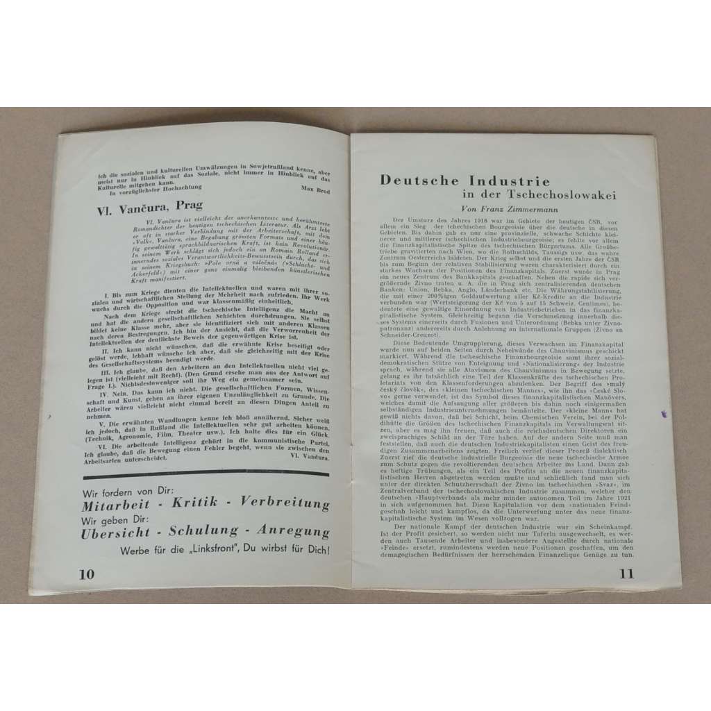 Německá (obsahově odlišná) verze komunistického časopisu "Levá fronta"; zaměřeno na otázky relevantní pro německy mluvící intelektuály v Československu. Viz obsah čísla na obálce.