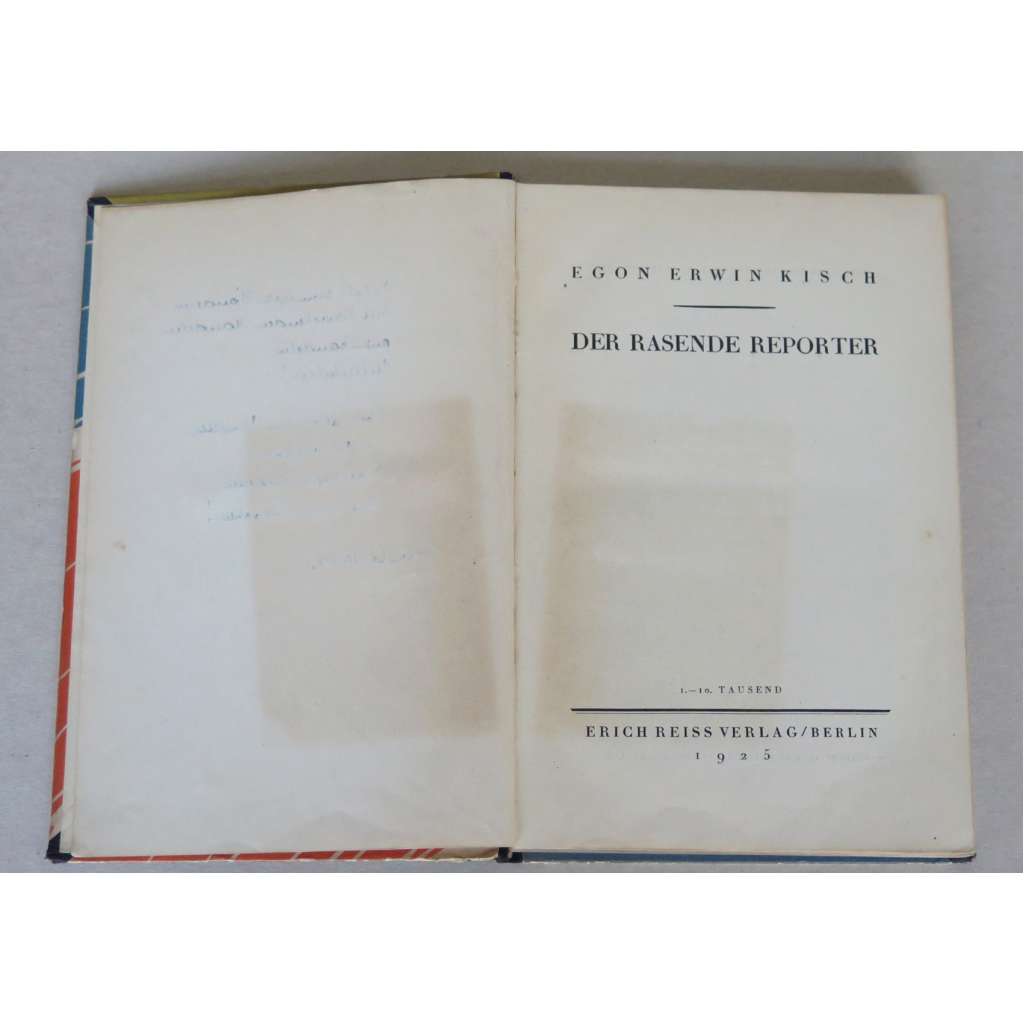 První vydání souboru reportáží "Der rasende Reporter" (Zuřivý reportér) od proslulého pražského novináře Egona Erwina Kische (1885-1948); vyšlo na konci roku 1924 (na titulním listu je uveden rok 1925). Jeden z prvních 10.000 výtisků.