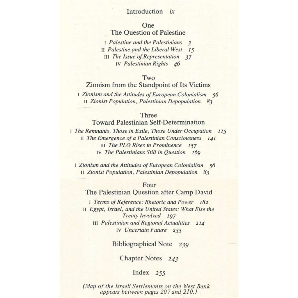 Kniha proslulého profesora Kolumbijské univerzity v New Yorku Edwarda W. Saida o palestinské otázce. Viz naskenované shrnutí a obsah. Druhý dotisk (červen 1980; vydáno 1979).