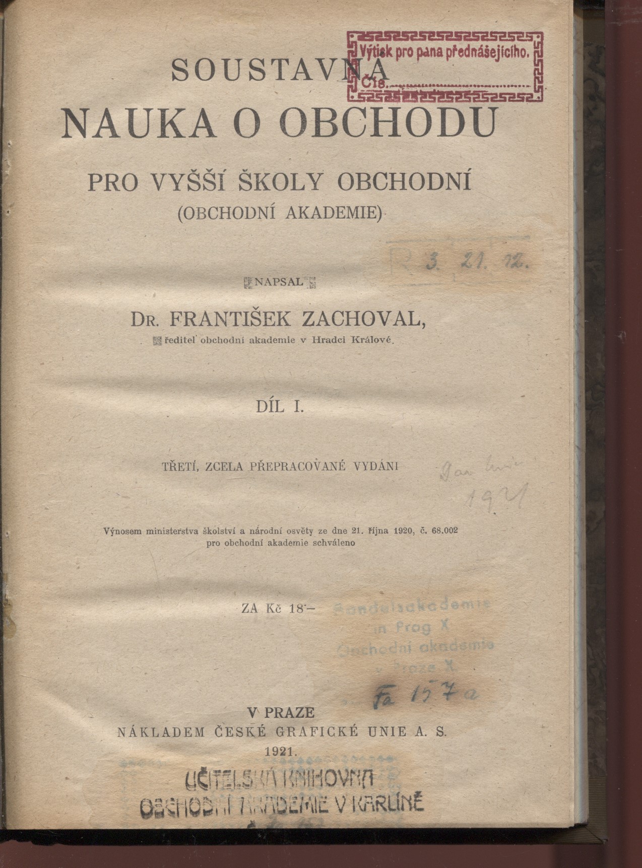 Horší stav, obálka je odřená a ušpiněná, hřbet je v dolní části téměř do poloviny natržený. Knižní blok je uvolněný z obálky, v textu je podtrháváno propiskou. Nerozřezáno.