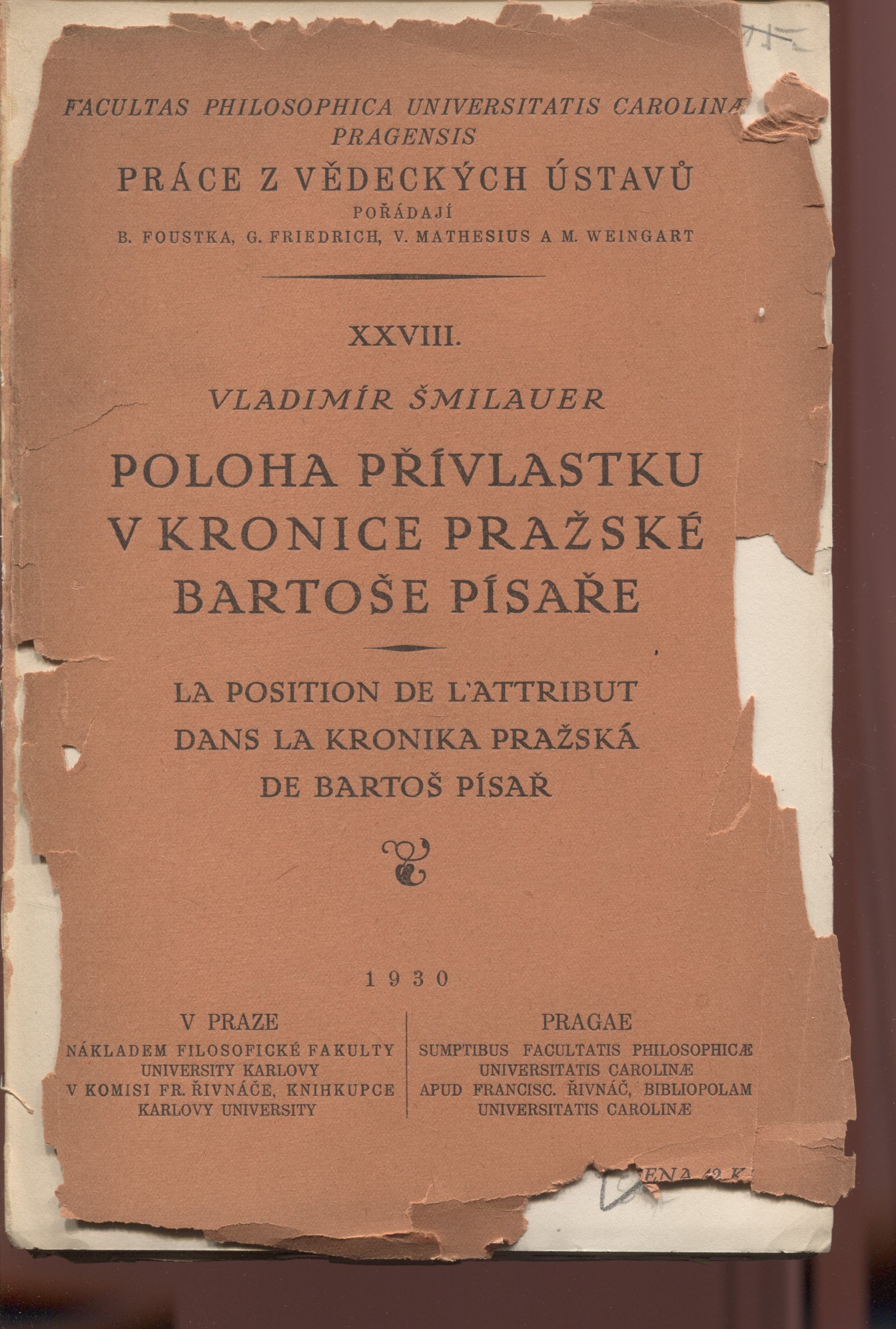 Stav dobrý, obálka ahřbet jsou lehce ušpiněné, v horní čáati obálky je nálepka.