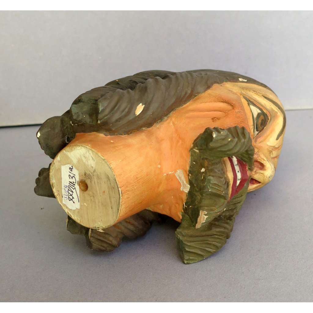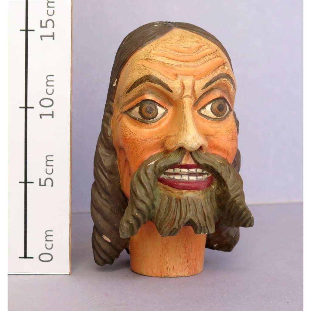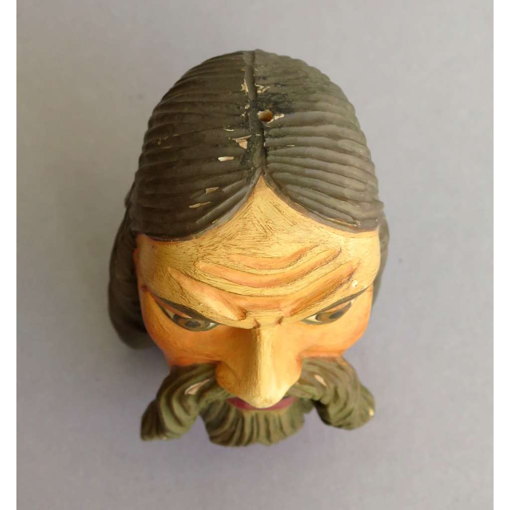 Hlava je vyřezaná ze dřeva. Pěkný příklad tradičního českého řemesla.