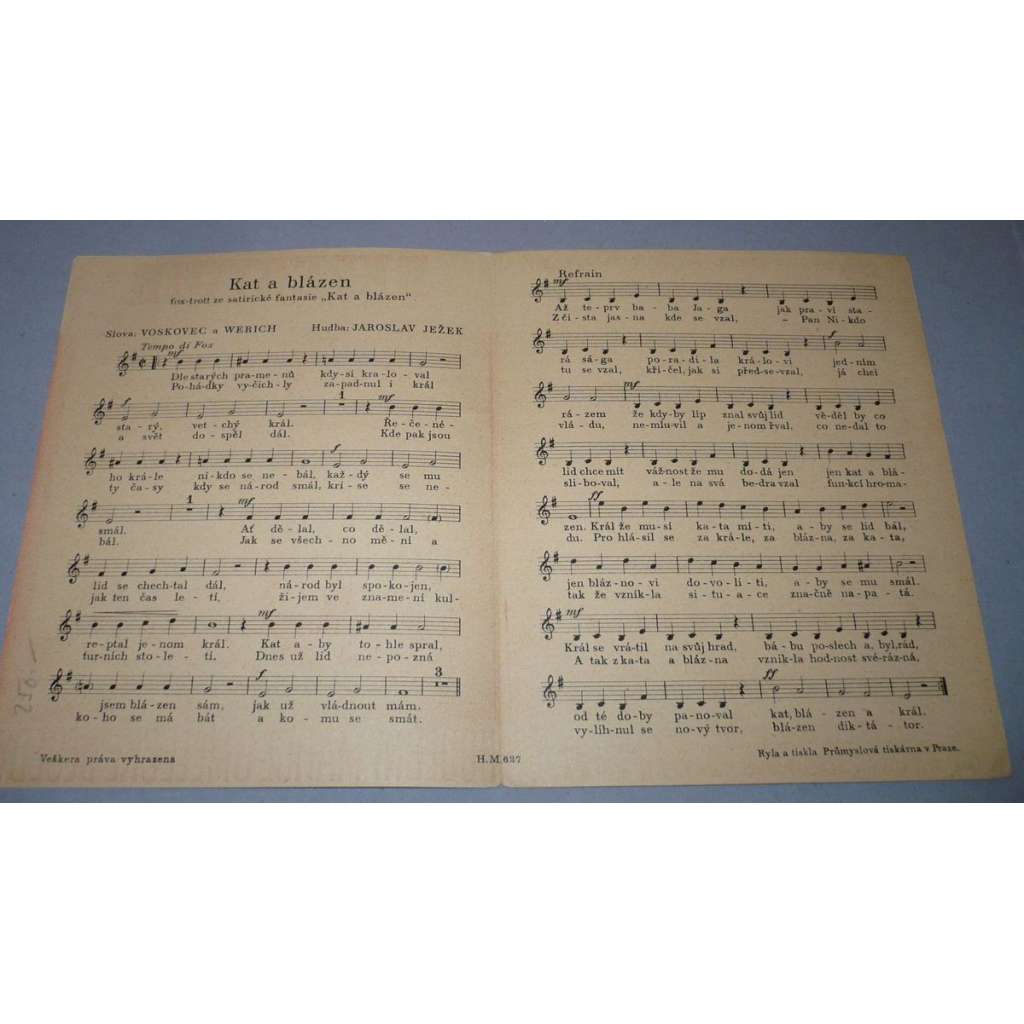 Stará písnička z první republiky, šlágr. Dvojlist (4 strany), složeno na 17 x 14 cm, uvnitř noty s textem písně. Repertoir Osvobozeného divadla.