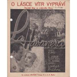 Stará písnička z první republiky, šlágr. Dvojlist (4 strany), složeno na 17 x 14 cm, uvnitř noty s textem písně. Tango z filmu "La Habanera".