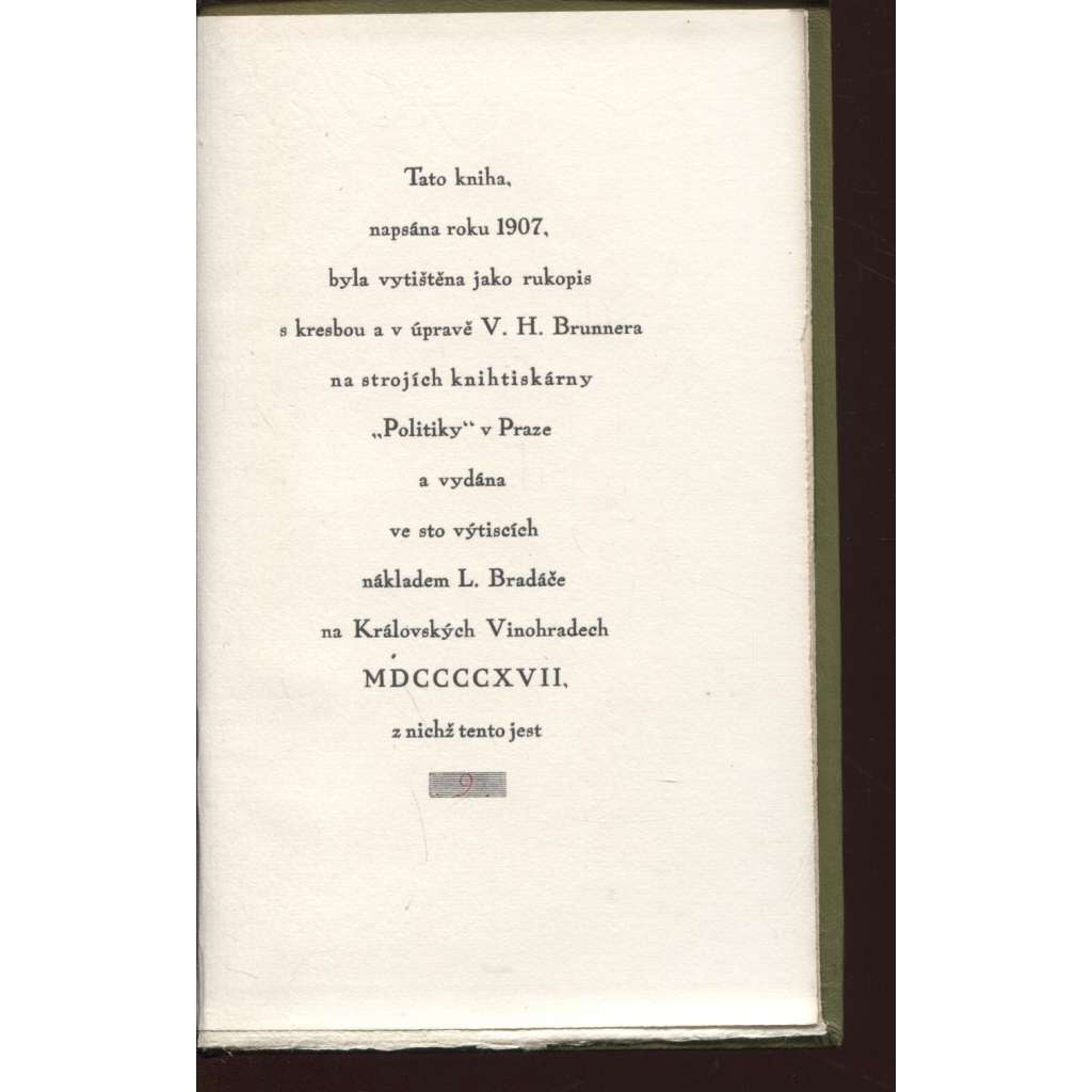 Vydal L. Bradáč, Praha 1917. Číslovaný výtisk, č. 9/100.