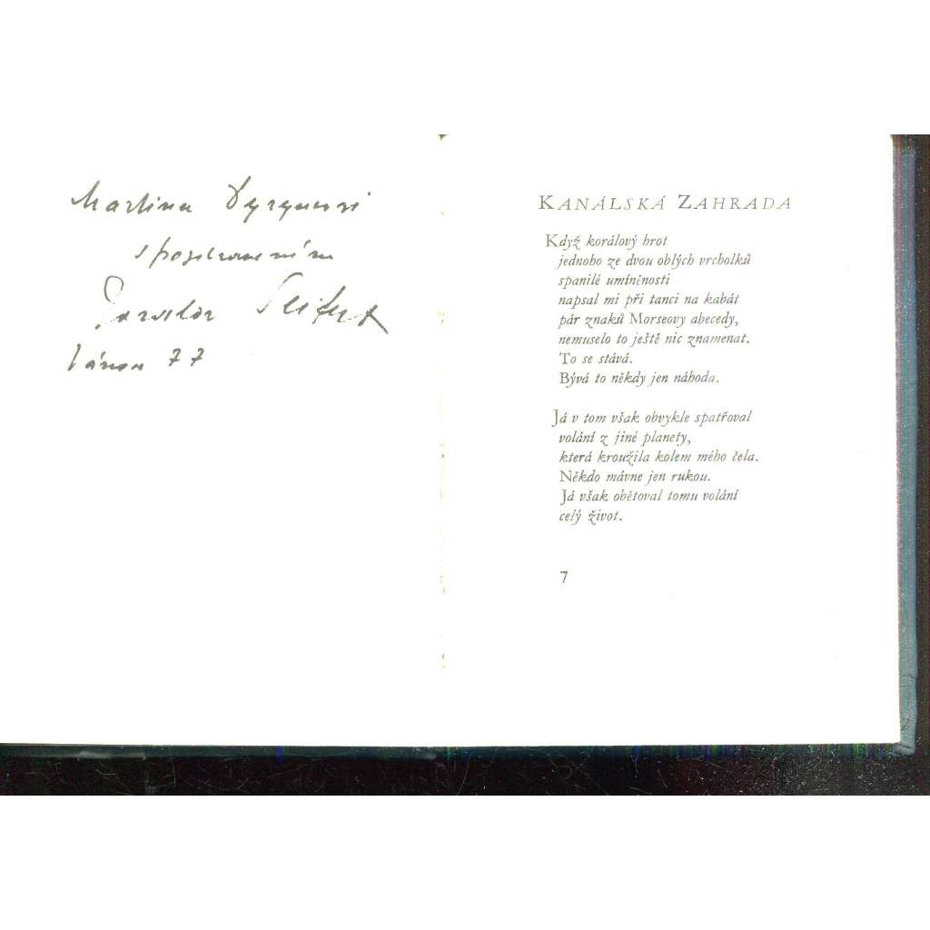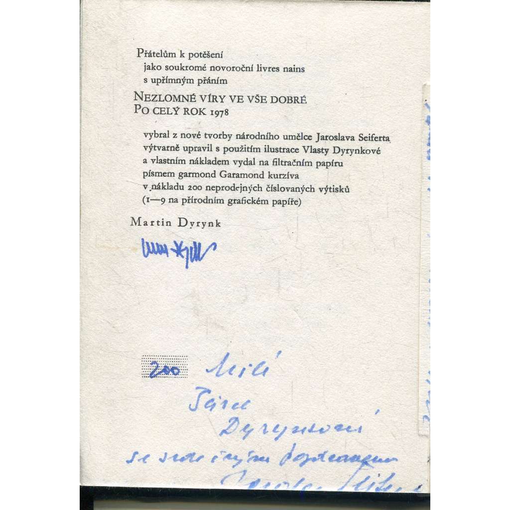 Bibliofilie. Se signovanou grafickou ilustrací Vlasty Dyrynkové. Podpis Martina Dyrynka. S věnováním Jaroslav Seiferta (v tiráži je jeho další věnování a podpis).