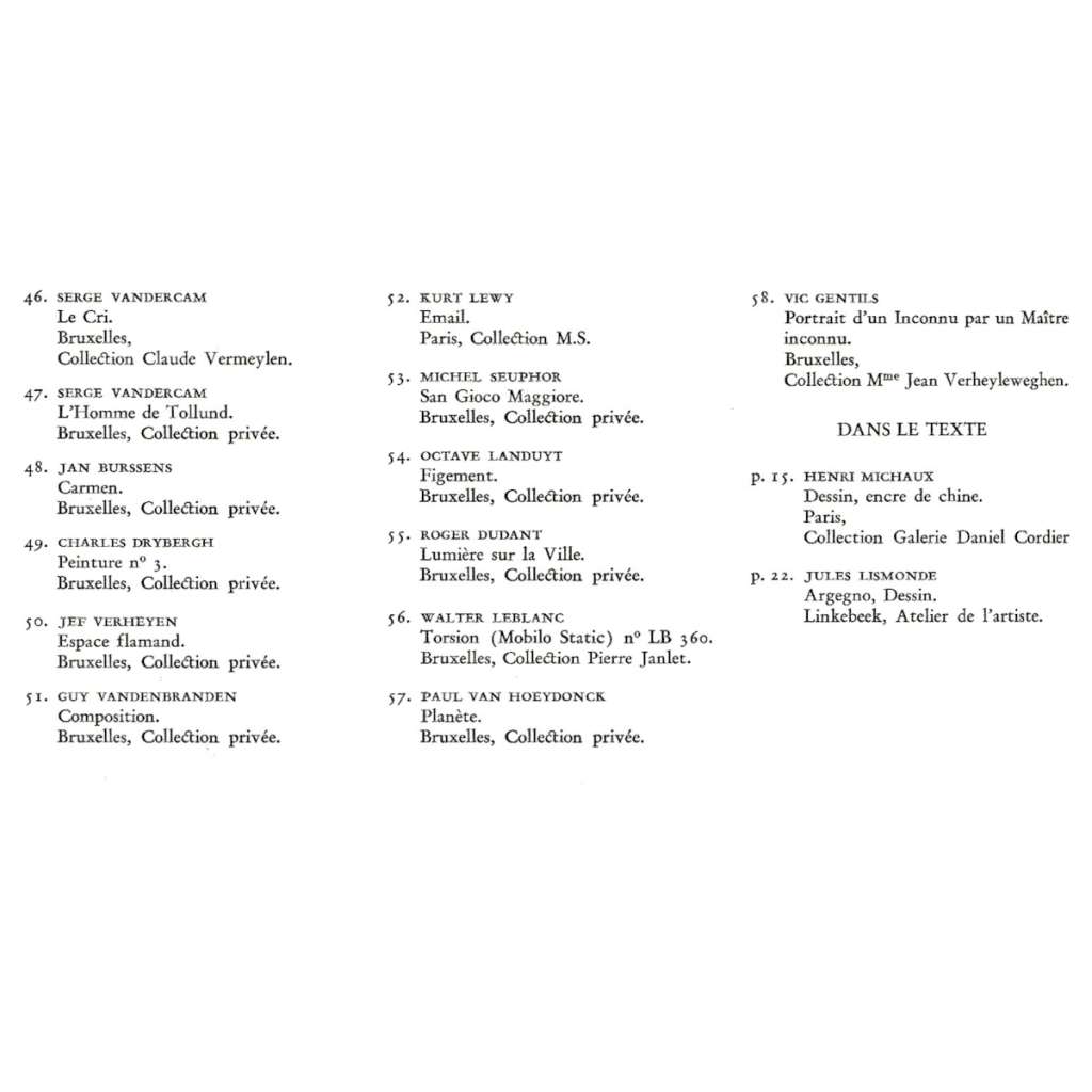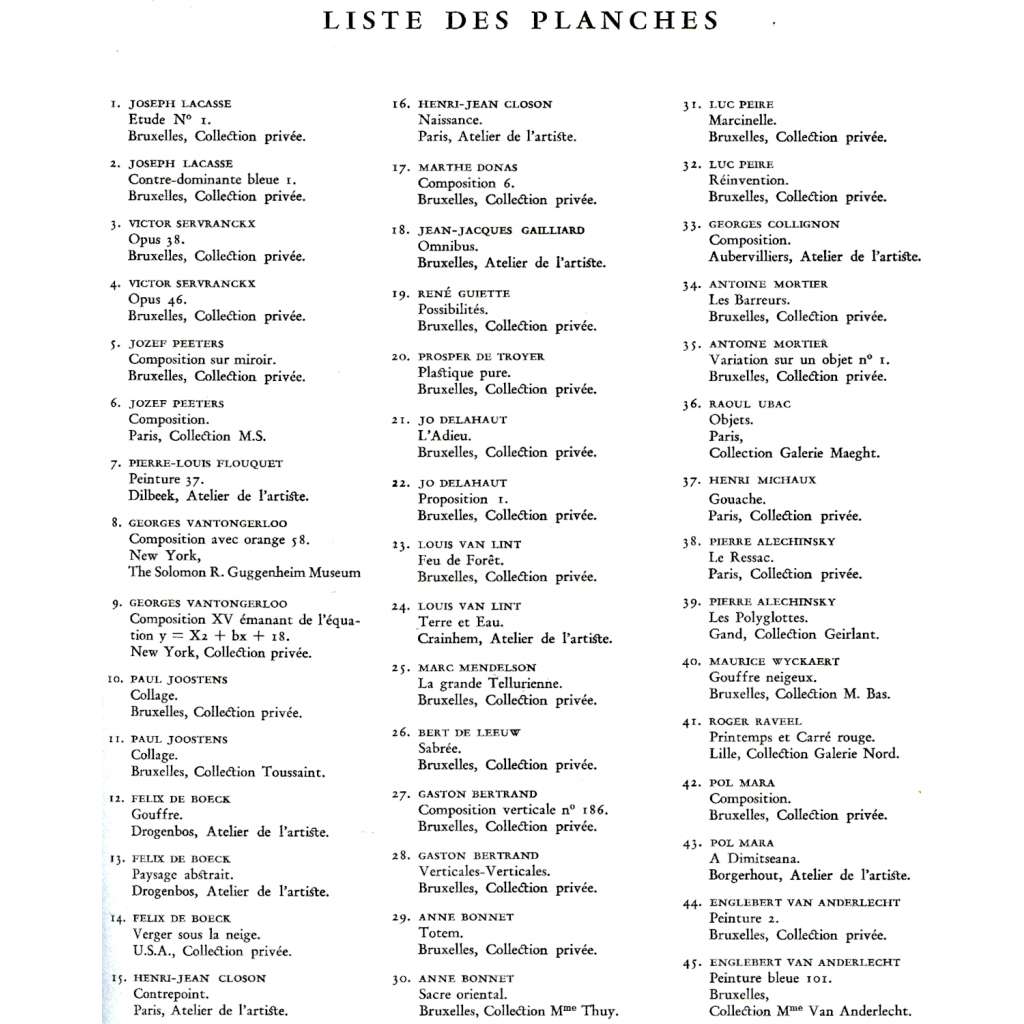 Původní složka obsahuje všech 57 tabulí s 58 kvalitními barevnými reprodukcemi děl belgických abstraktních malířů a brožuru s úvodní studií Jeana Dypréaua a krátkými biografiemi zastoupených umělců; viz naskenovaný seznam malířů. Jde o 9. publikaci edice "L'Art en Belgique".