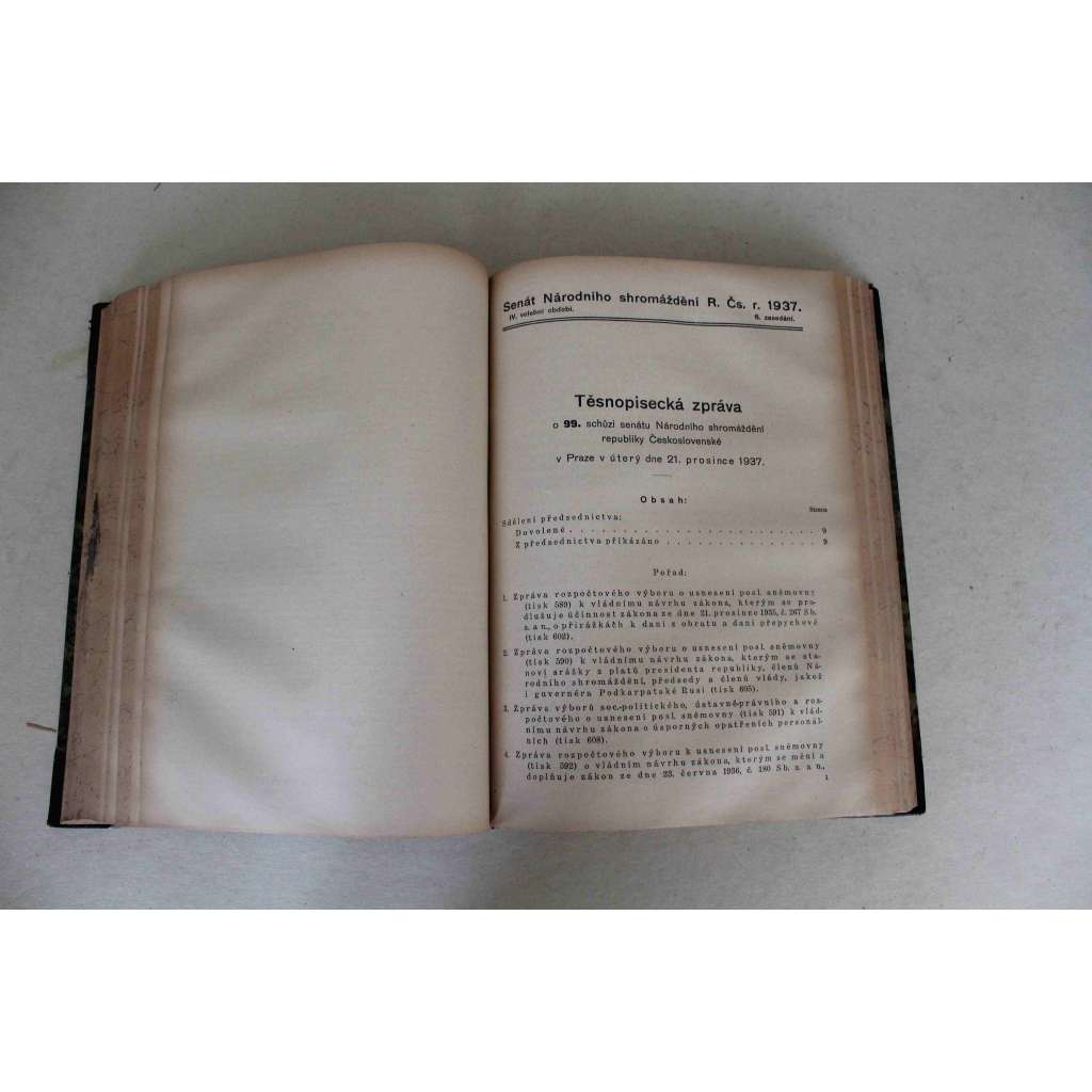 Těsnopisecké zprávy o schůzích senátu Národního shromáždění republiky Československé 1937-1938. Schůze 89-108 (senát, první republika, tisky, zákony, úmrtí Masaryk, rozpočet; polokožená vazba - vazba kůže)