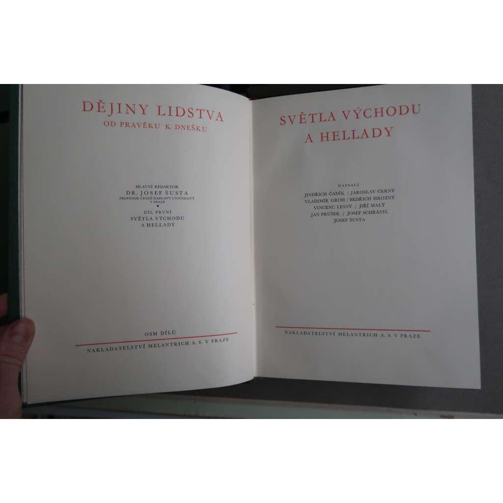 Díl první, Světla východu a Hellady / hlavní redaktor Josef Šusta ; napsali Jindřich Čadík, Jaroslav Černý, Vladimír Groh, Bedřich Hrozný, Vincenc Lesný, Jiří Malý, Jan Průšek, Josef Schránil, Josef Šusta, 1940, 701 stran.