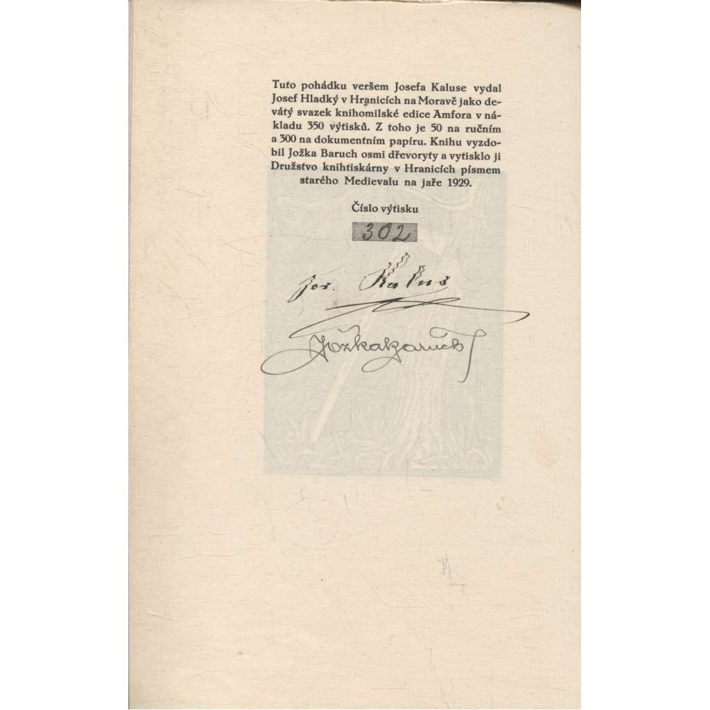 Knihu 8 dřevoryty vyzdobil Jožka Baruch. Číslovaný výtisk, č. 302.