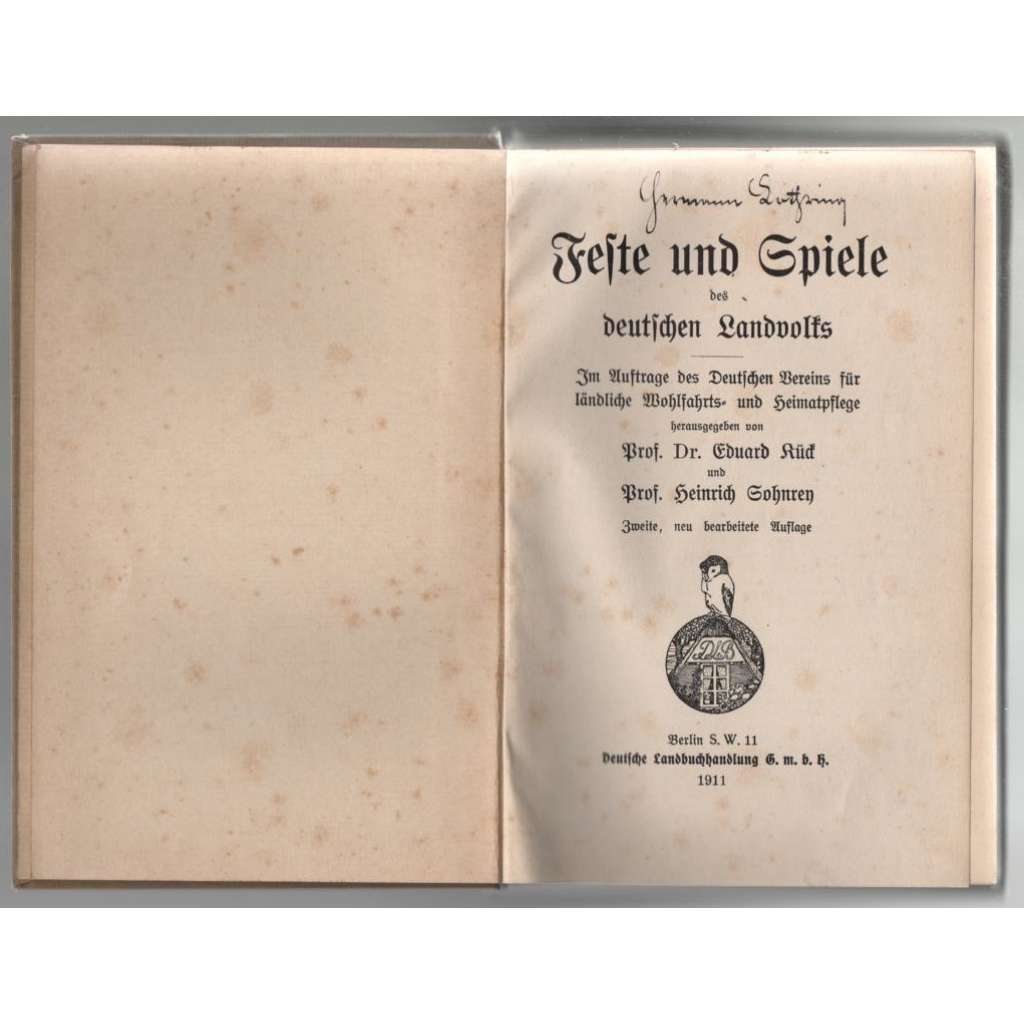 Vydání: Berlin: Deutsche Landbuchhandlung 1911. Pův. plátěná vazba s titulem na hřbetu a přední desce, obrázkem na deskách, červenou horní ořízkou a podpisem, 312 stran psaných frakturou, 8° (13 x 19 cm)