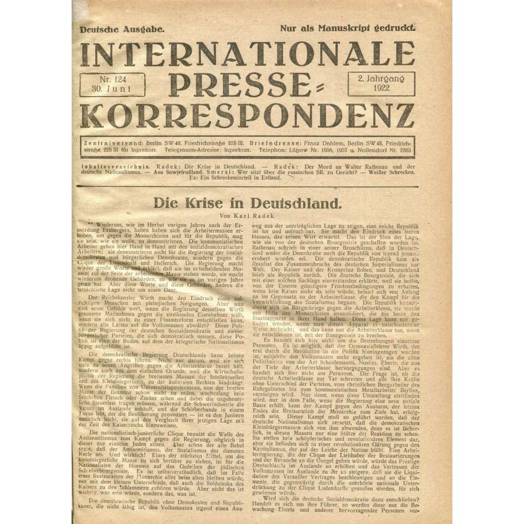 Druhá polovina (Halbjahr) druhého ročníku mezinárodní tiskové služby Komunistické internacionály. Zahrnuje čísla od 30. 6. 1922 (č. 124) do 30. 12. 1922 (č. 245); doplněno rejstříky pro tuto druhou polovinu ročníku; žádné číslo nechybí. Rozděleno na dva fyzické svazky.