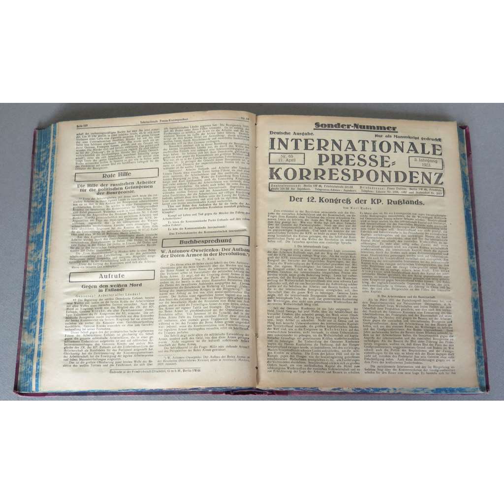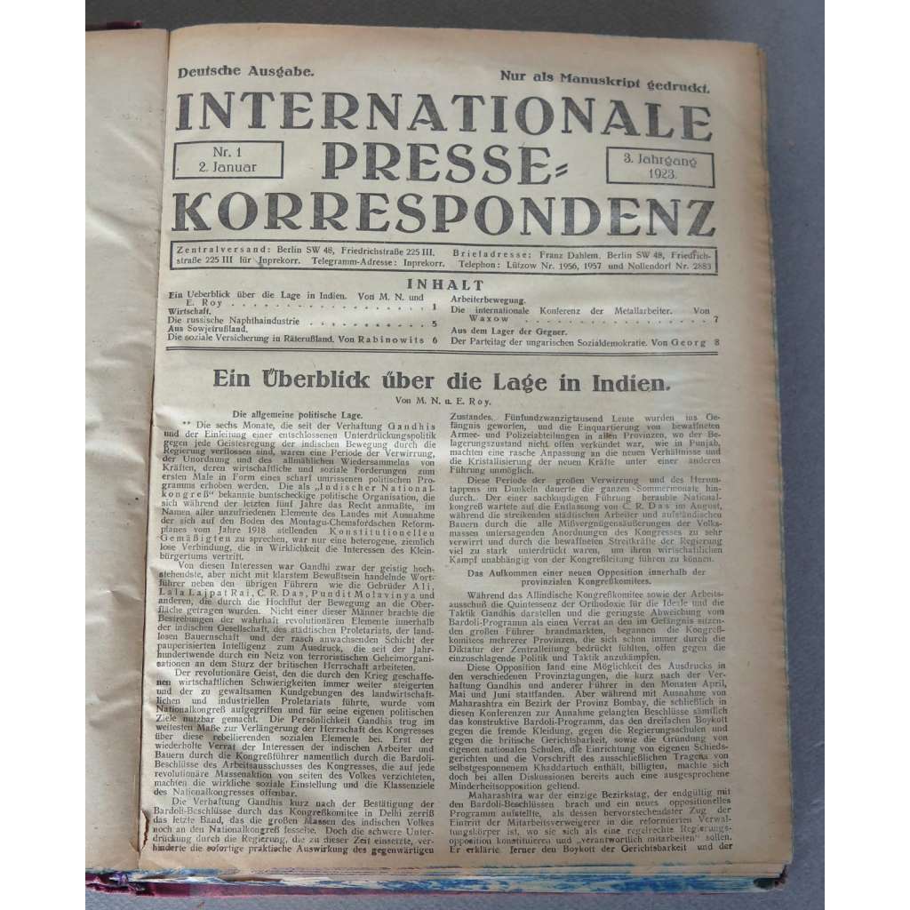První polovina (Halbjahr) třetího ročníku mezinárodní tiskové služby Komunistické internacionály. Zahrnuje čísla od 2. 1. 1923 (č. 1) do 29. 6. 1923 (č. 109); doplněno rejstříky pro tuto druhou polovinu ročníku; žádné číslo nechybí.