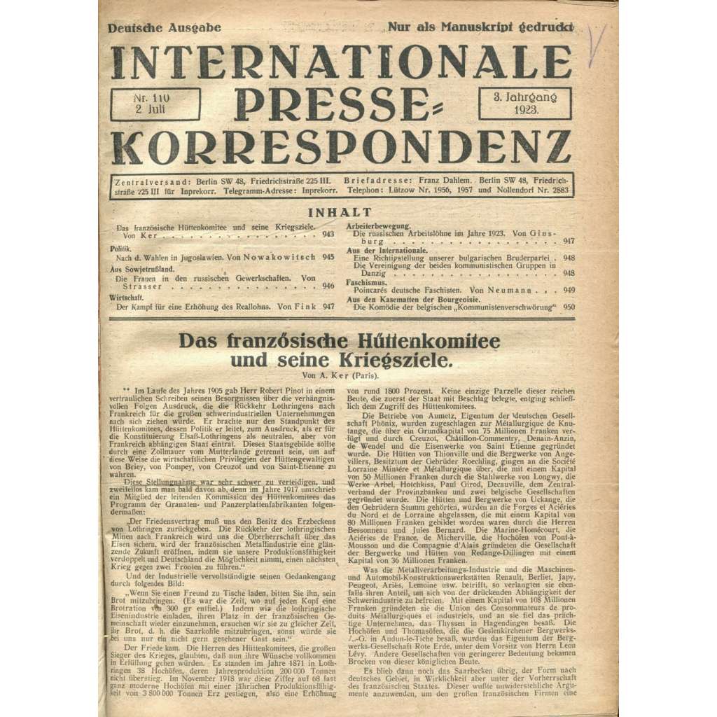 Druhá polovina (Halbjahr) třetího ročníku mezinárodní tiskové služby Komunistické internacionály. Zahrnuje čísla od 2. 7. 1923 (č. 110) do 31. 12. 1923 (č. 186); doplněno rejstříky pro tuto druhou polovinu ročníku; žádné číslo nechybí.