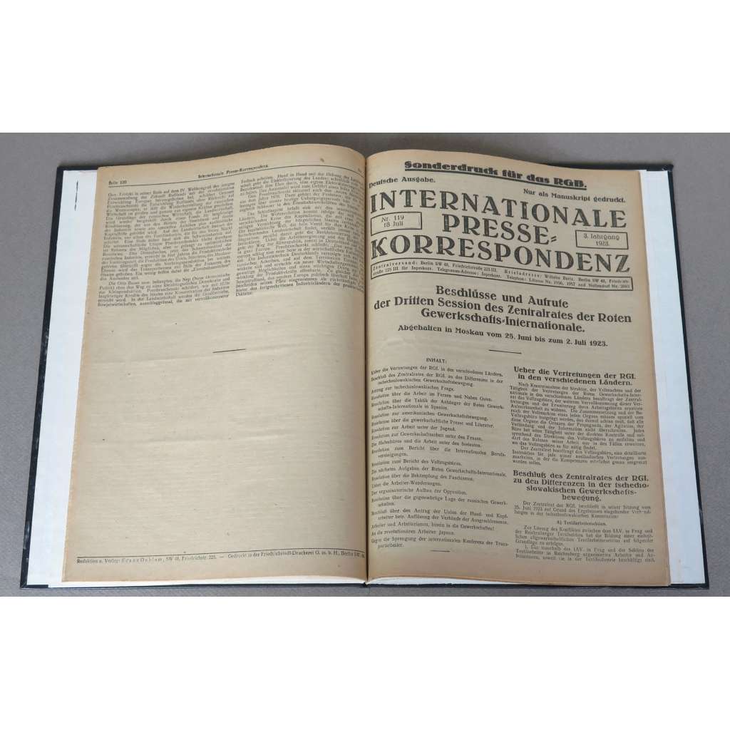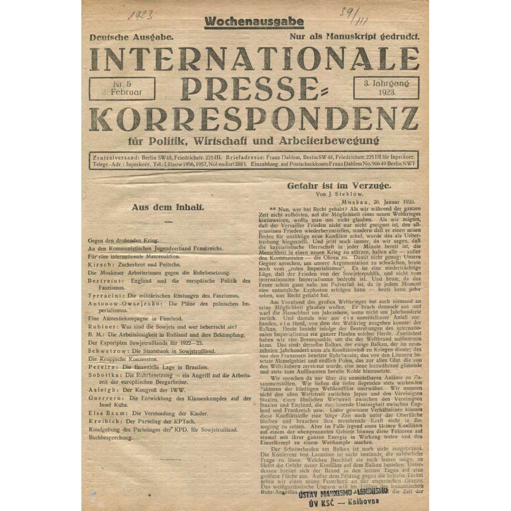 Tři čísla třetího ročníku mezinárodní tiskové služby Komunistické internacionály: č. 5 (5. 2. 1923), č. 119 (18. 7. 1923) a č. 179 (23. 11. 1923) Svázáno do jednoho svazku.