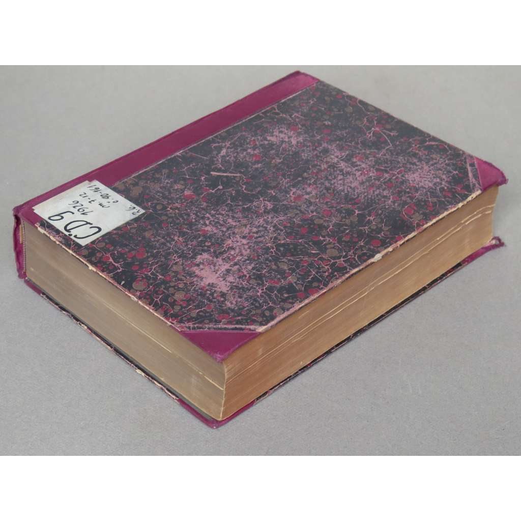 Stav knihy: Dobrý stav; desky opotřebované, zadní deska s nalepeným štítkem, na přední předsádce razítka a poznámky knihovny, přední volná předsádka a první list odděleny z vazby, první list podél předního okraje otřepený, ořízka zažloutlá, na několika stránkách je razítko knihovny.