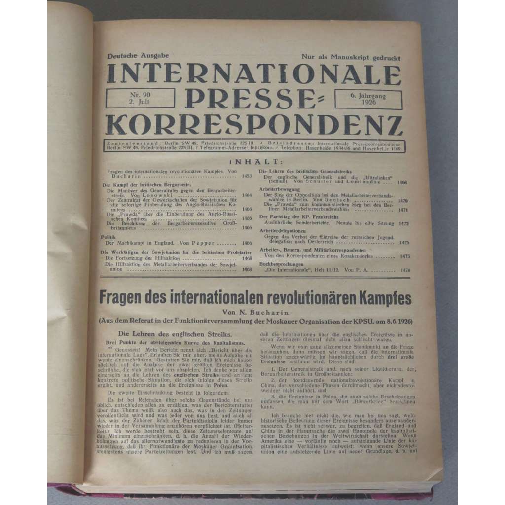 Druhá polovina (Halbjahr) šestého ročníku mezinárodní tiskové služby Komunistické internacionály. Zahrnuje čísla od 2. 7. (č. 90) do 31. 12. 1926 (č. 161); doplněno rejstříky pro tuto druhou polovinu ročníku; vevázáno i všech 13 čísel přílohy "Chronik der Politik und der Arbeiterbewegung"; žádné číslo nechybí.