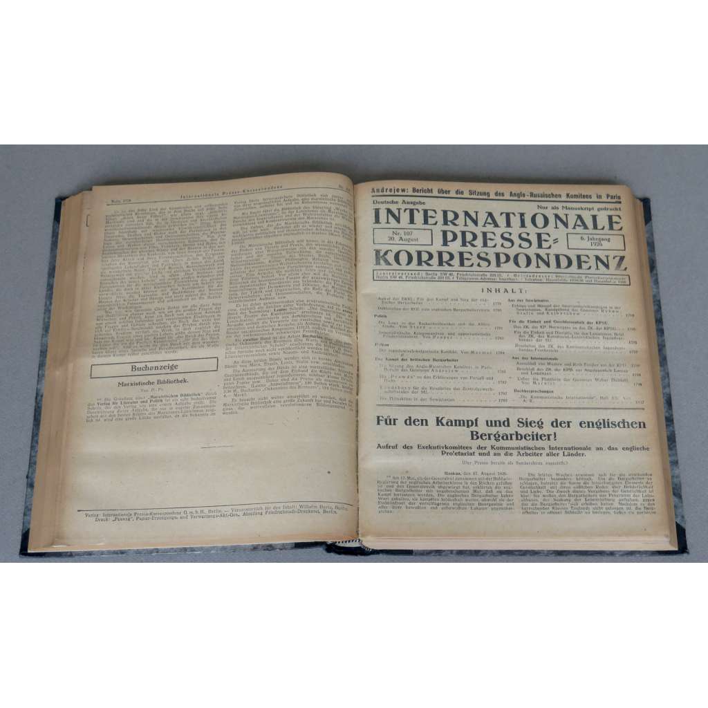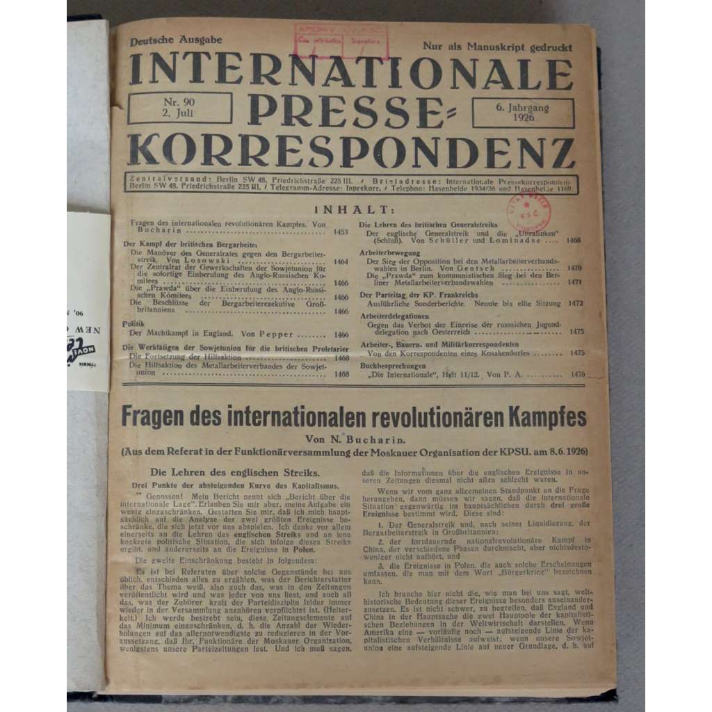 Některá čísla druhé poloviny (Halbjahr) šestého ročníku mezinárodní tiskové služby Komunistické internacionály. Zahrnuje čísla od 2. 7. (č. 90) do 23. 12. 1926 (č. 157), konkrétně č. 90–93, 96–103, 106–109, 112–113, 124–127, 130–138, 141, 150–154 a 157, včetně několika čísel přílohy "Chronik der Politik und der Arbeiterbewegung"; polovina čísel chybí, není vevázán ani rejstřík pro druhou polovinu ročníku.