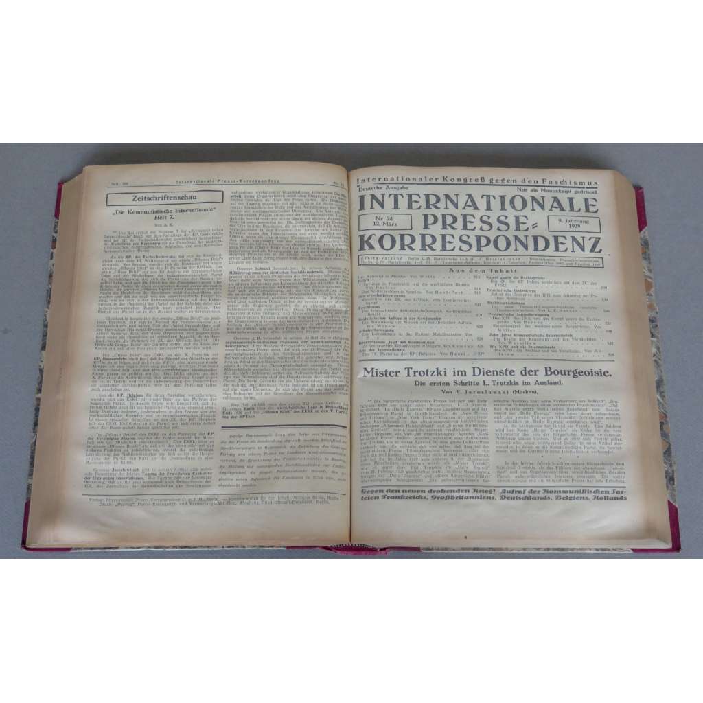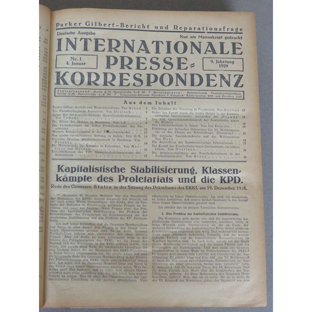 První polovina (Halbjahr) devátého ročníku mezinárodní tiskové služby Komunistické internacionály. Zahrnuje čísla od 4. 1. (č. 1) do 28. 6. 1929 (č. 56); doplněno rejstříky pro tuto první polovinu ročníku; žádné číslo nechybí.